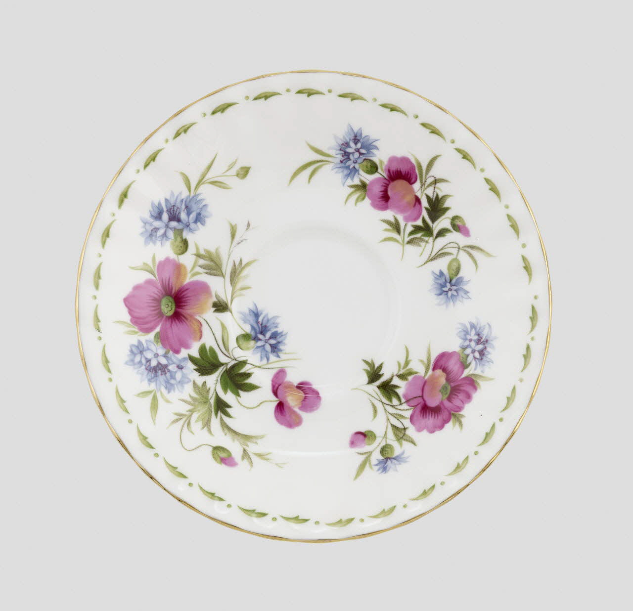 Lieu : Royaume-UniDate : 1970L' English Bone China est composée de kaolin, de feldspath et de poudre d'os. Après fusion, ces matières forment un article de table d'une blancheur exceptionnelle, d'une transparence inégalée et d'une grande solidité. Ce service Royal Albert authentique de 12 pièces est consacré aux douze mois de l'année : à chaque mois est associé une fleur. Il n’est plus fabriqué, les nouvelles productions sont des copies faites dans l’esprit du Royal Albert selon Sasha Zanko, le vendeur. Le copyright du modèle date de 1970.