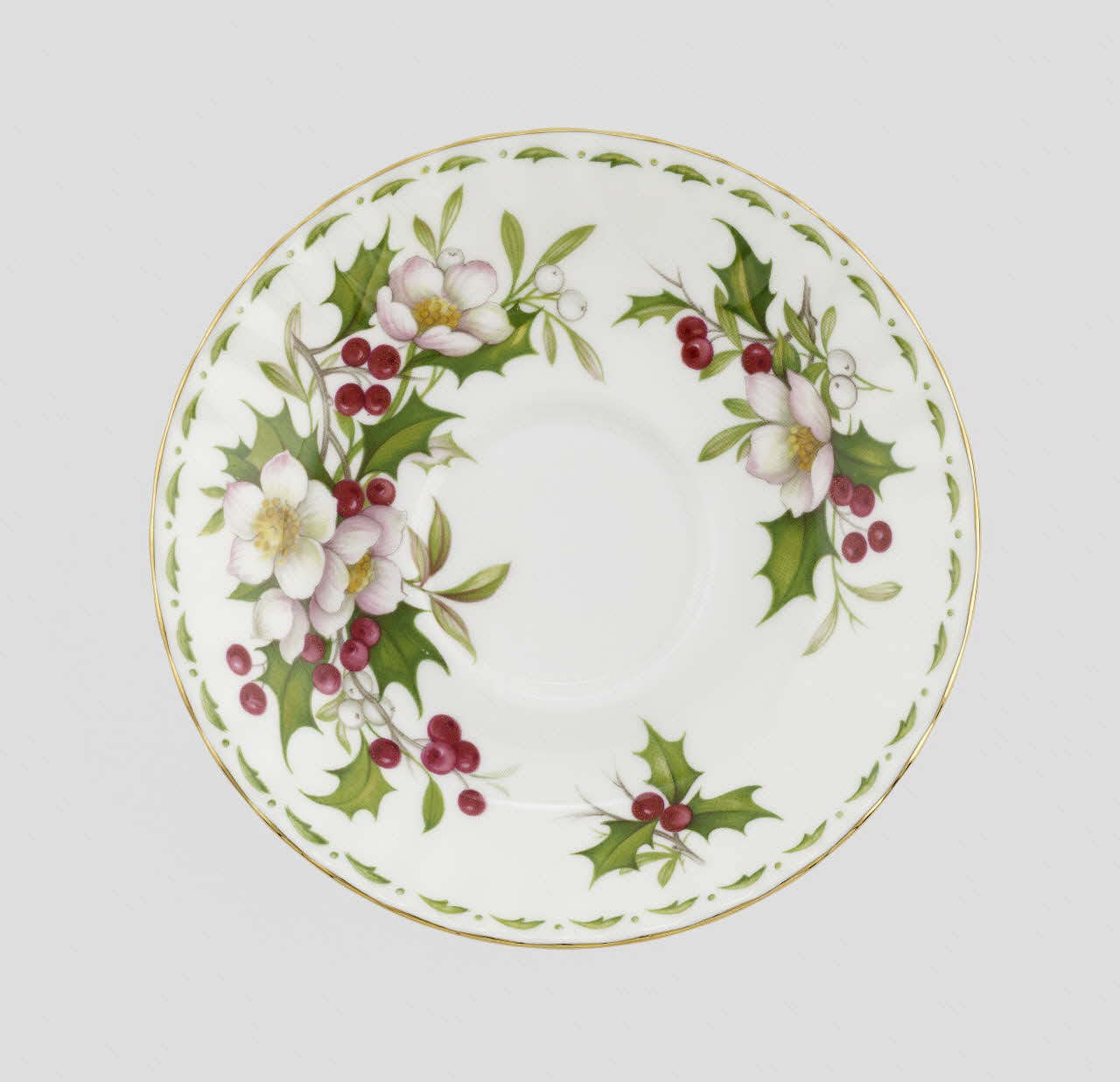 La soucoupe est ornée d'un décor similaire. Sur le pourtour on observe une frise végétale puis trois bouquets de roses de Noël encadrent le renfoncement central de la soucoupe. Les bords sont dorés d'un trait continu.Inscriptions