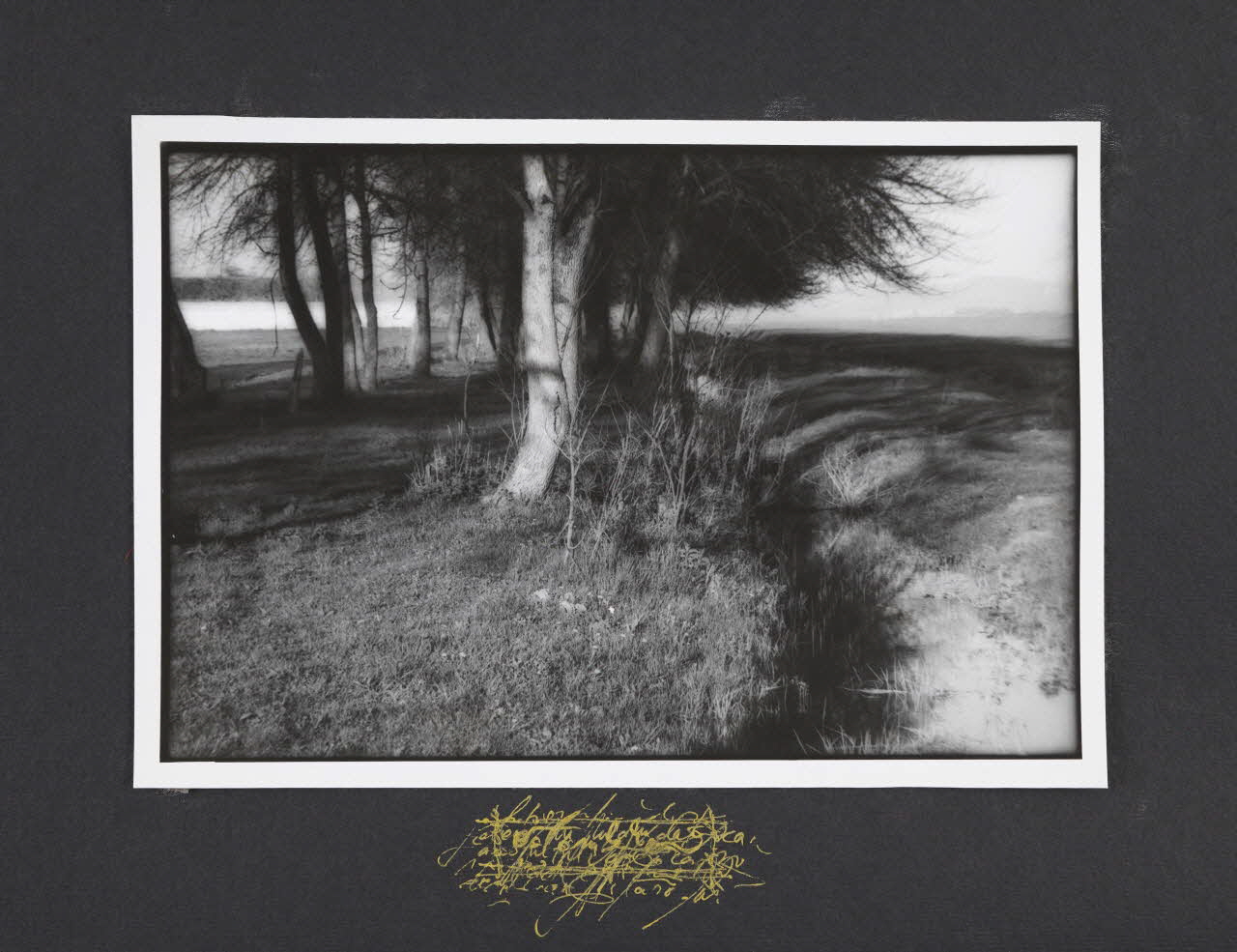 Cette photographie en noir et blanc représente un paysage. Elle est collée sur un passe partout de couleur noire sur lequel on peut lire des inscriptions en jaune. Le tout est encadré. Le cadre d'origine est sculpté de motifs géométriques qui n'est pas sans rappeler le travail traditionnel du bois en Roumanie.Décor
