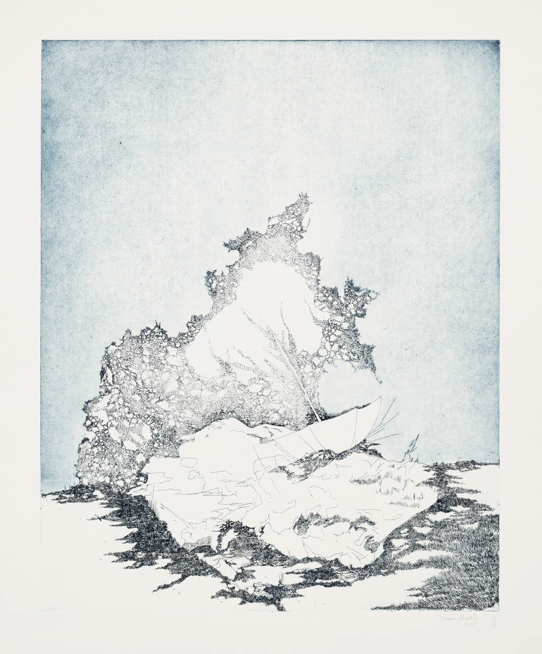 Estampe représentant un paysage hivernal sur fond bleu, avec au centre un parapluie renversé.Inscriptions