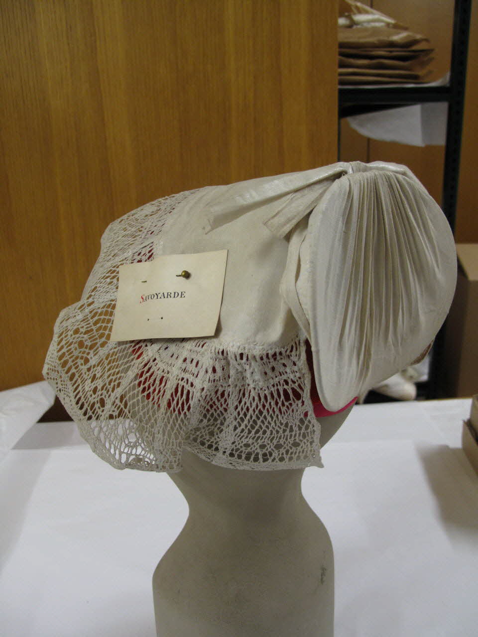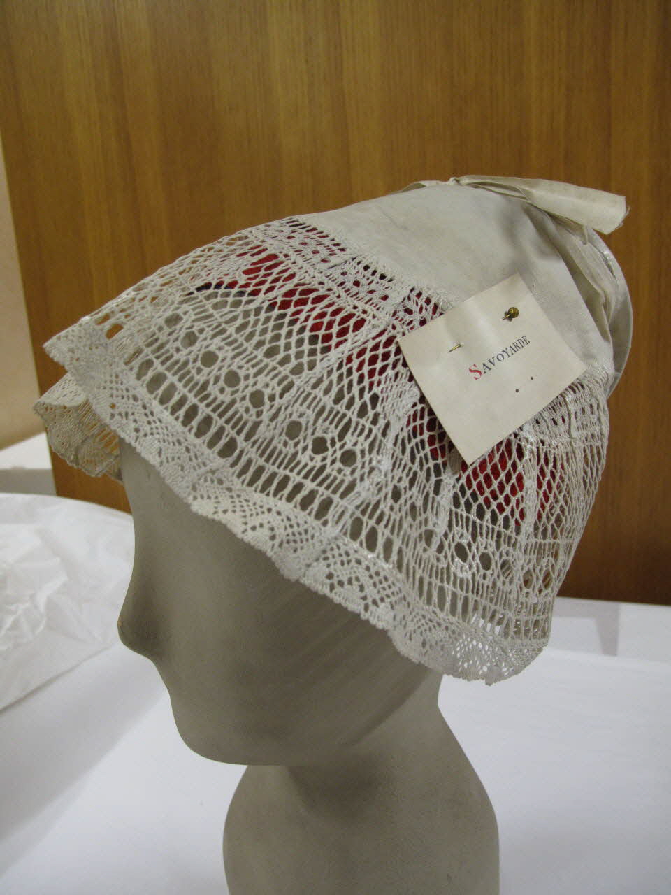Le devant de la passe est prolongé d'un large volant arrondi dans le bas de dentelle de coton empesé à décor géométrique. La sous-coiffe (.2) est composée d'un petit bonnet de velours marron côtelé, bordé d'une bande de lainage rouge et doublé de tissu satiné bleu. Un ruban de satin rose fushia est cousu de part et d'autre du visage. Deux épingles à tête ronde fixent la sous-coiffe et la coiffe.Matériaux et techniques