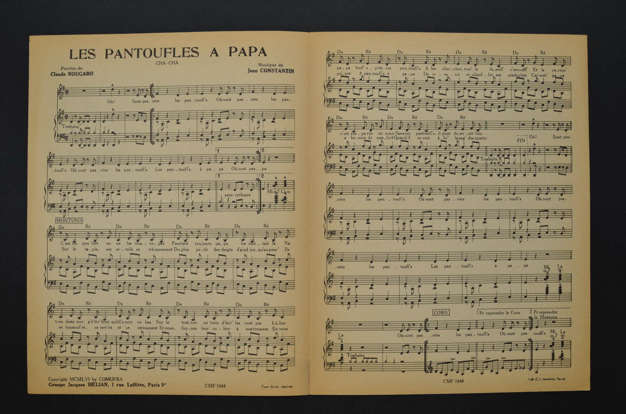 Sur la couverture, les portraits photographiques de Jean Constantin, jouant du piano (à gauche) et de Jacques Hélian et son orchestre (à droite). Les inscriptions renseignent le titre de la chanson, le nom des auteurs, de l'artiste et de l'éditeur.