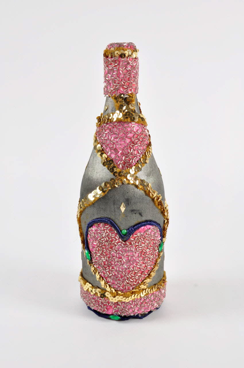 Bouteille en verre, cylindrique à haut col et goulot circulaire. Elle est entièrement recouverte de résille noire, et de fragments de satin rose brodés de petites perles tubulaires blanches et bordés de frises de paillettes dorées. Des petites pastilles en verroterie verte et dorée sont collées par endroits.
