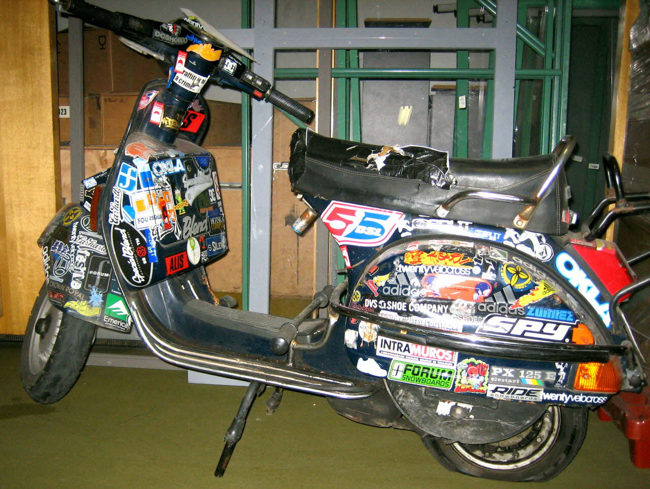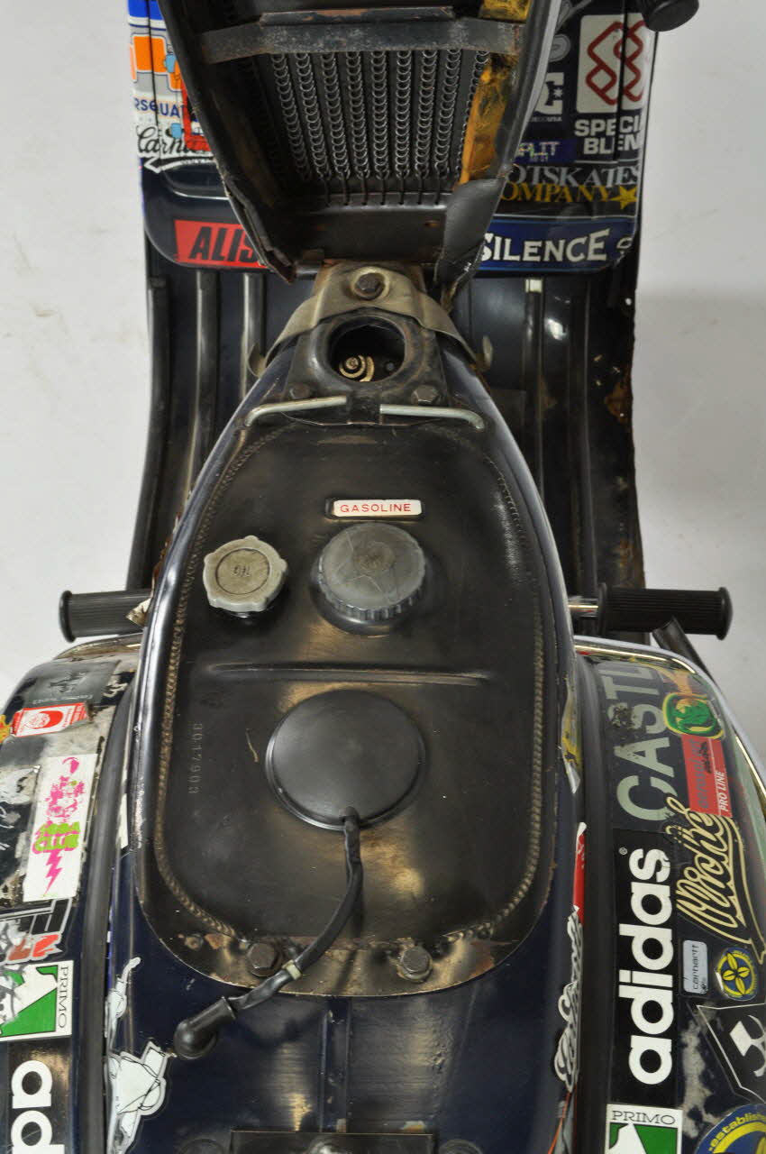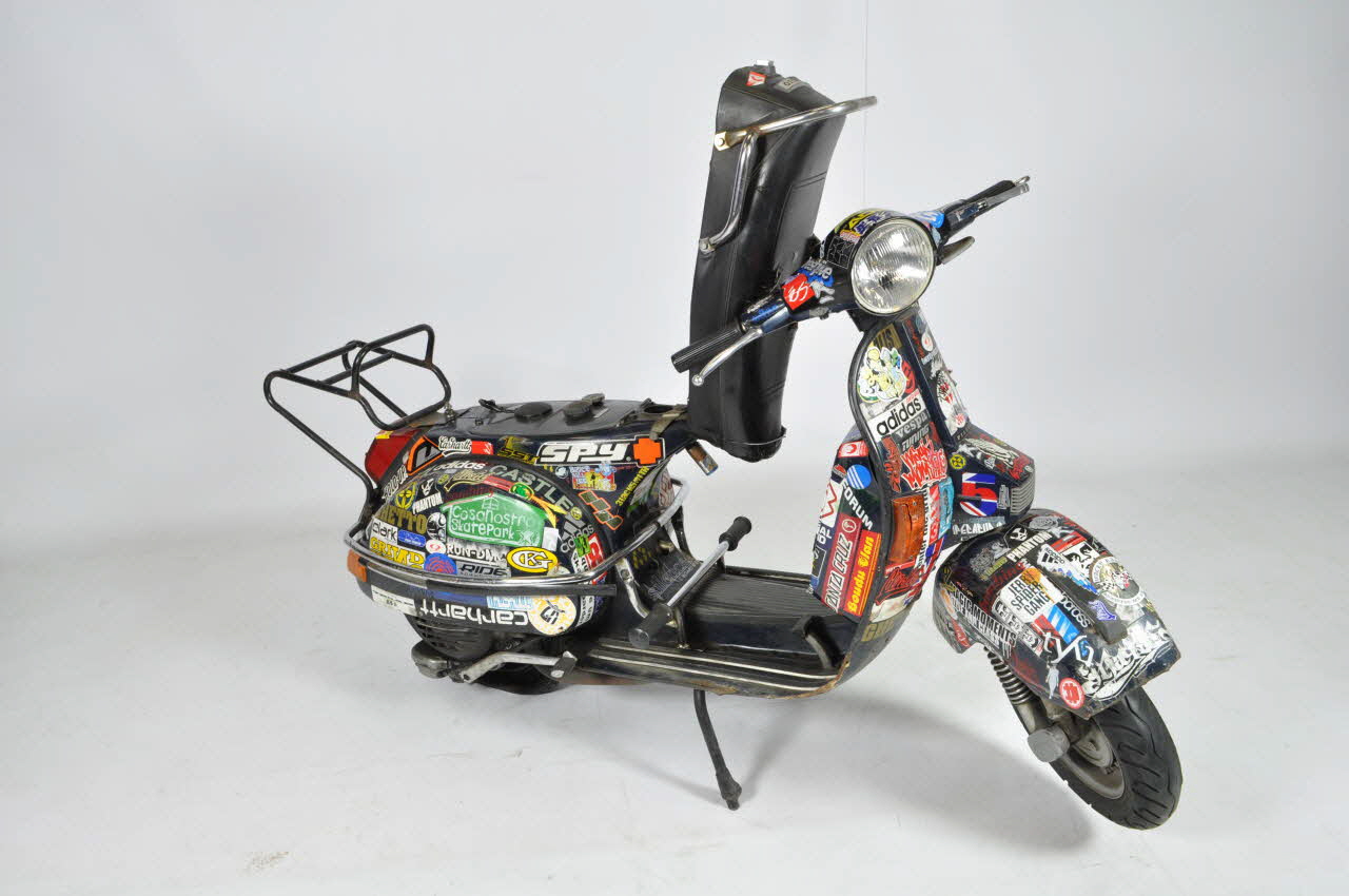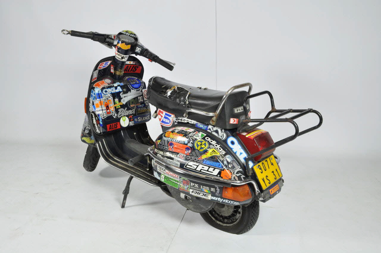 Scooter à deux roues recouvert d'autocollants. Une selle deux places rembourée de mousse synthétique et recouverte de vinyle noir présente un petit dossier fait de barres d'acier. Un porte bagage en fer peint en noir se trouve à l'arrière. Les gardes boue sont renforcés de barres d'acier. A l'arrière, deux clignotants, un phare rouge, et une plaque d'immatriculation jaune. Un démareur en aluminium avec pièce de caoutchouc à l'extrémité, deux repose-pieds sur une barre de fer bordée de caoutchouc, et une pédale de vitesse sont présents. La base du repose-pied du conducteur est bordée de lamelles de caoutchouc.