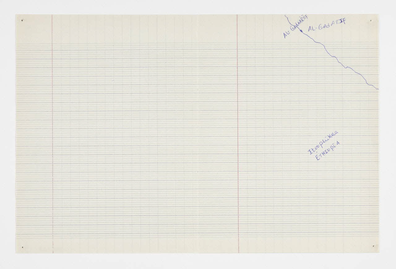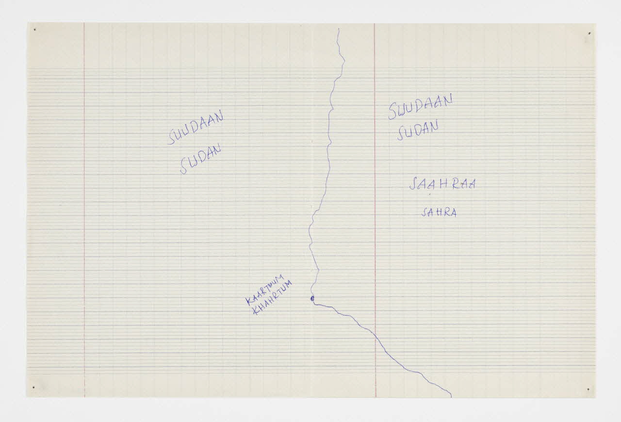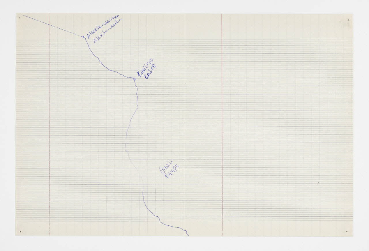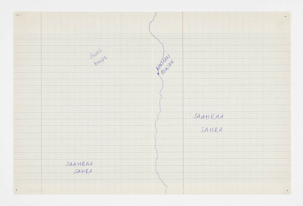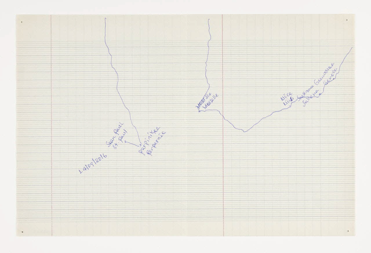 Lieu : Saint-Paul-de-Fenouillet, Pyrénées-Orientales, Occitanie, FranceDate : 2016Mathieu Pernot a acheté sur un marché aux puces des vieux cahiers d'écoliers lui rappelant son enfance, sur lesquels il a invité Mustaddin Jewar et Sabbontu Ahmed à retracer l'itinéraire de leur migration depuis Robe (Ethiopie) jusqu'à leur arrivée en France. Pour ce faire, ils ont tracé leurs itinéraires sur les feuilles de cahier d'après la carte du monde qui était projetée dessus. Réalisé à Saint-Paul-de-Fenouillet dans une structure d'hébergement pour migrants. Ce projet de co-création a été mené lors de la résidence de l'artiste au mémorial du camp de Rivesaltes (Pyrénées-Orientales) en 2016.
