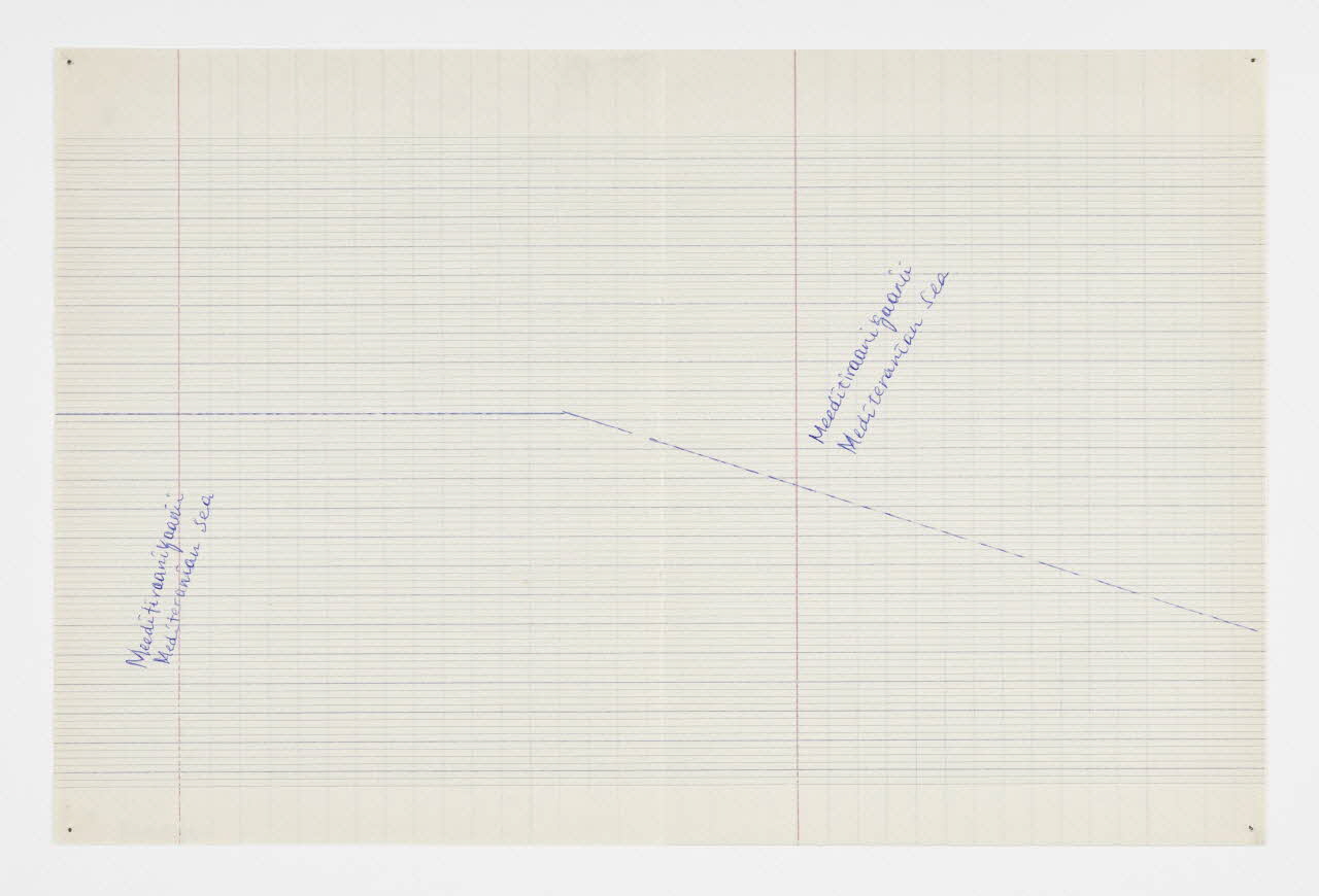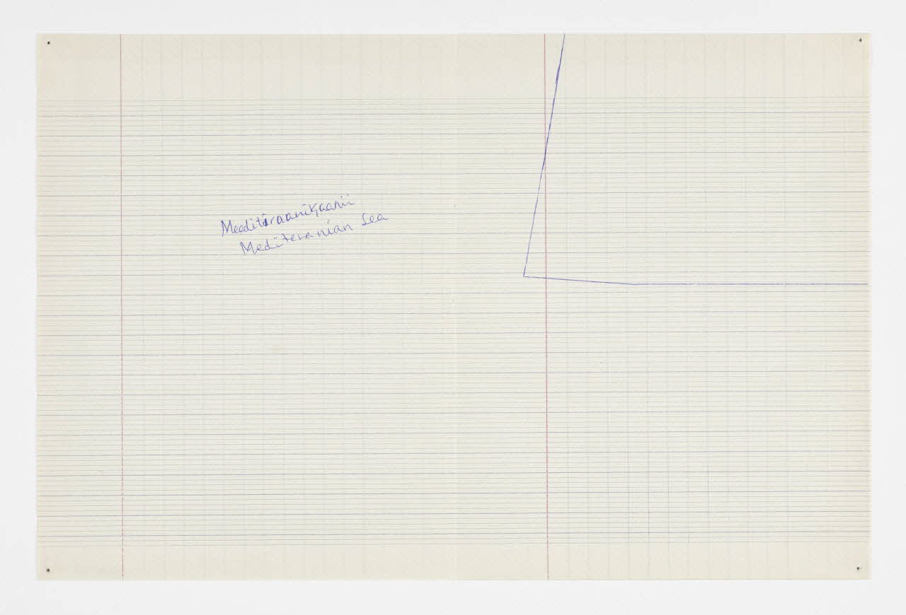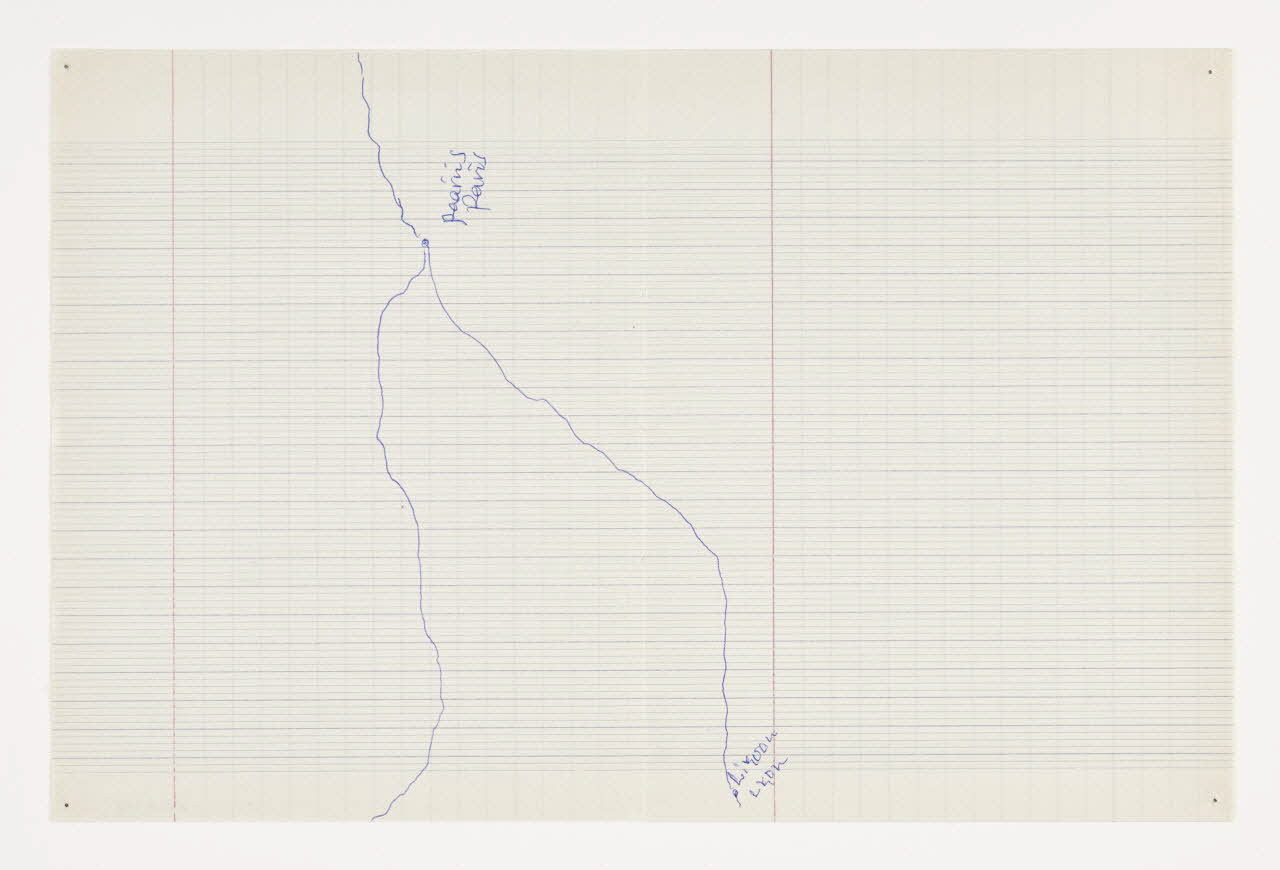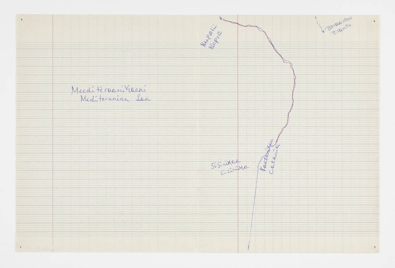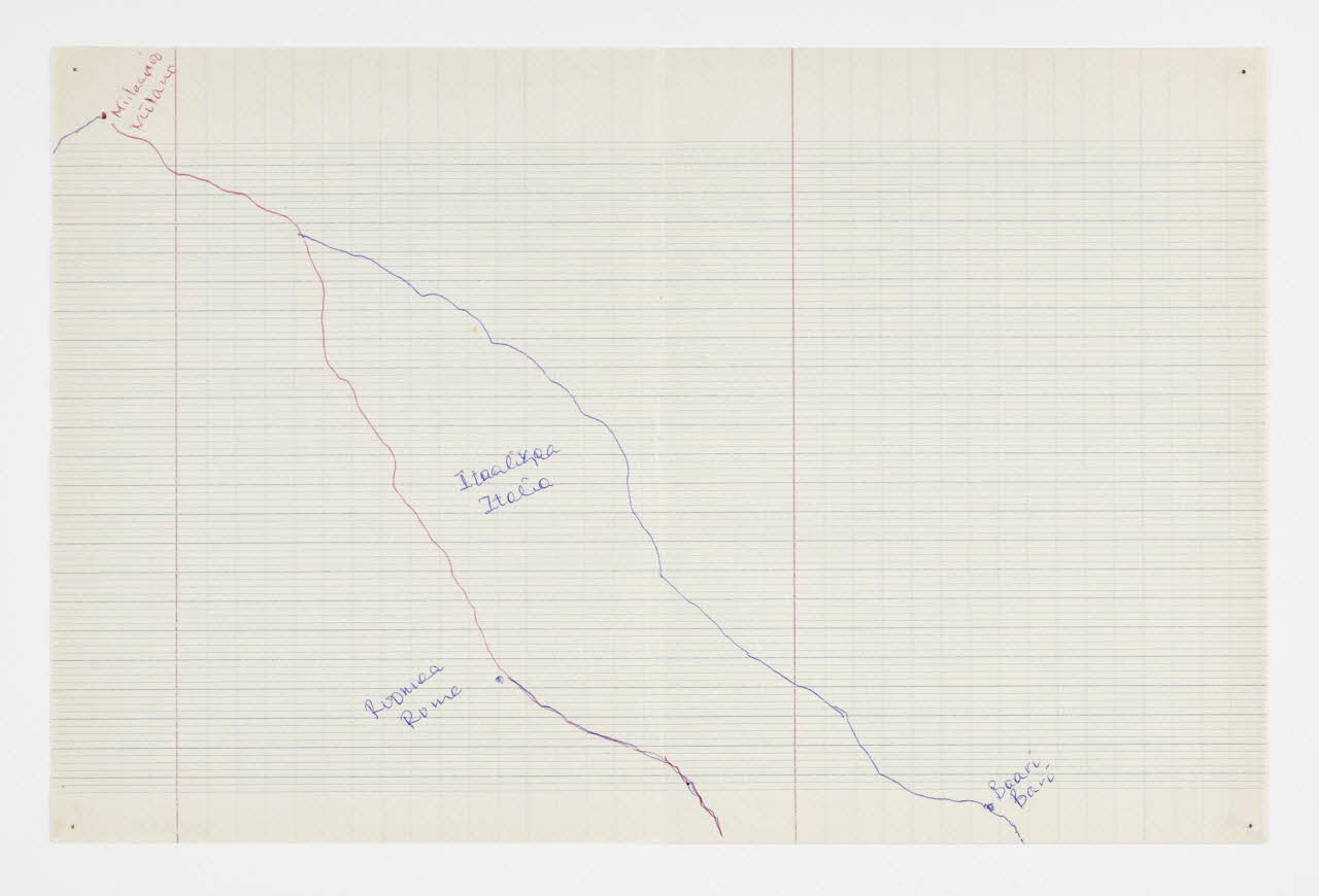 Lieu : Saint-Paul-de-Fenouillet, Pyrénées-Orientales, Occitanie, FranceDate : 2016Mathieu Pernot a acheté sur un marché aux puces des vieux cahiers d'écoliers lui rappelant son enfance, sur lesquels il a invité Mustaddin Jewar et Sabbontu Ahmed à retracer l'itinéraire de leur migration depuis Robe (Ethiopie) jusqu'à leur arrivée en France. Pour ce faire, ils ont tracé leurs itinéraires sur les feuilles de cahier d'après la carte du monde qui était projetée dessus. Réalisé à Saint-Paul-de-Fenouillet dans une structure d'hébergement pour migrants. Ce projet de co-création a été mené lors de la résidence de l'artiste au mémorial du camp de Rivesaltes (Pyrénées-Orientales) en 2016.