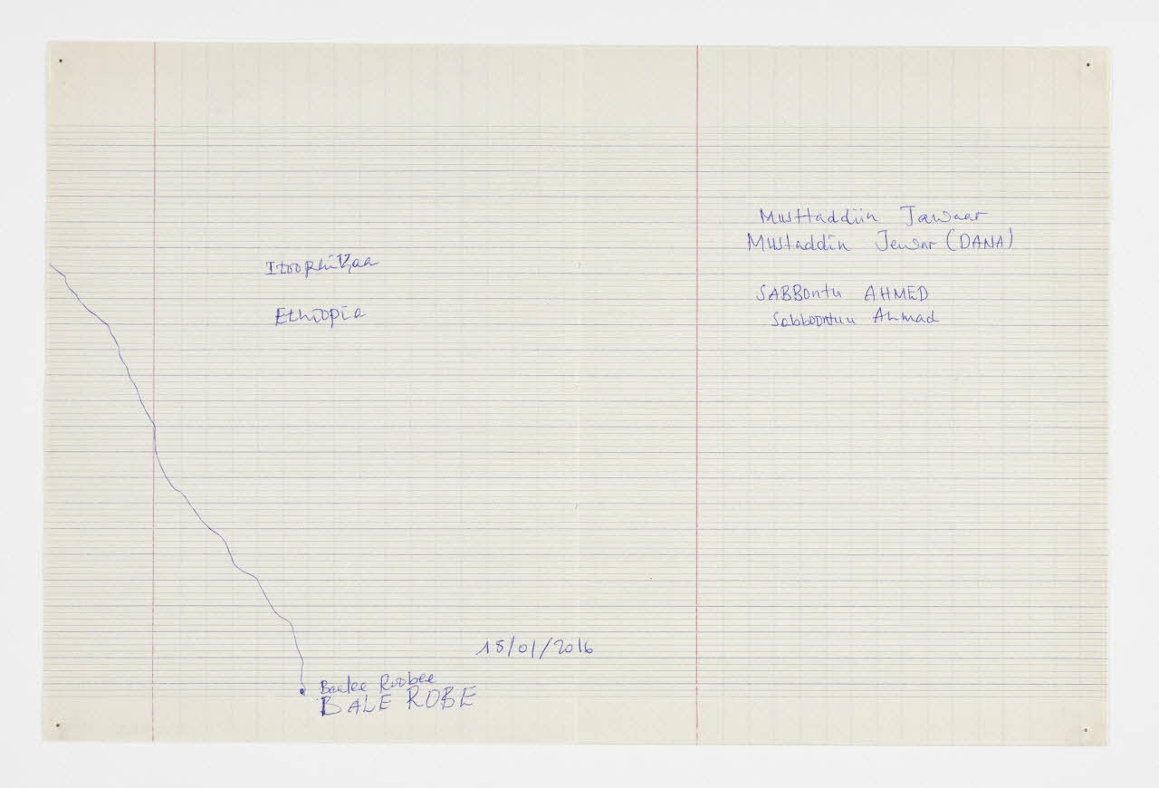 Jewar Mustaddin est un Ethiopien en situation de migration ayant participé avec Mathieu Pernot à la création de l'oeuvre "Le Voyage" en 2016. Sur l'un des cahiers, il a tracé son itinéraire de migration depuis Robe (Ethiopie) jusqu'en France.