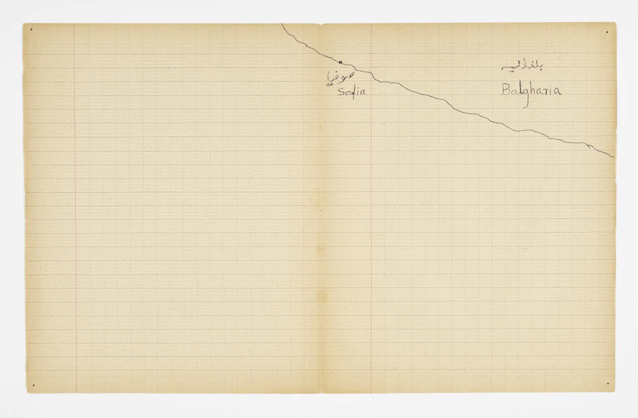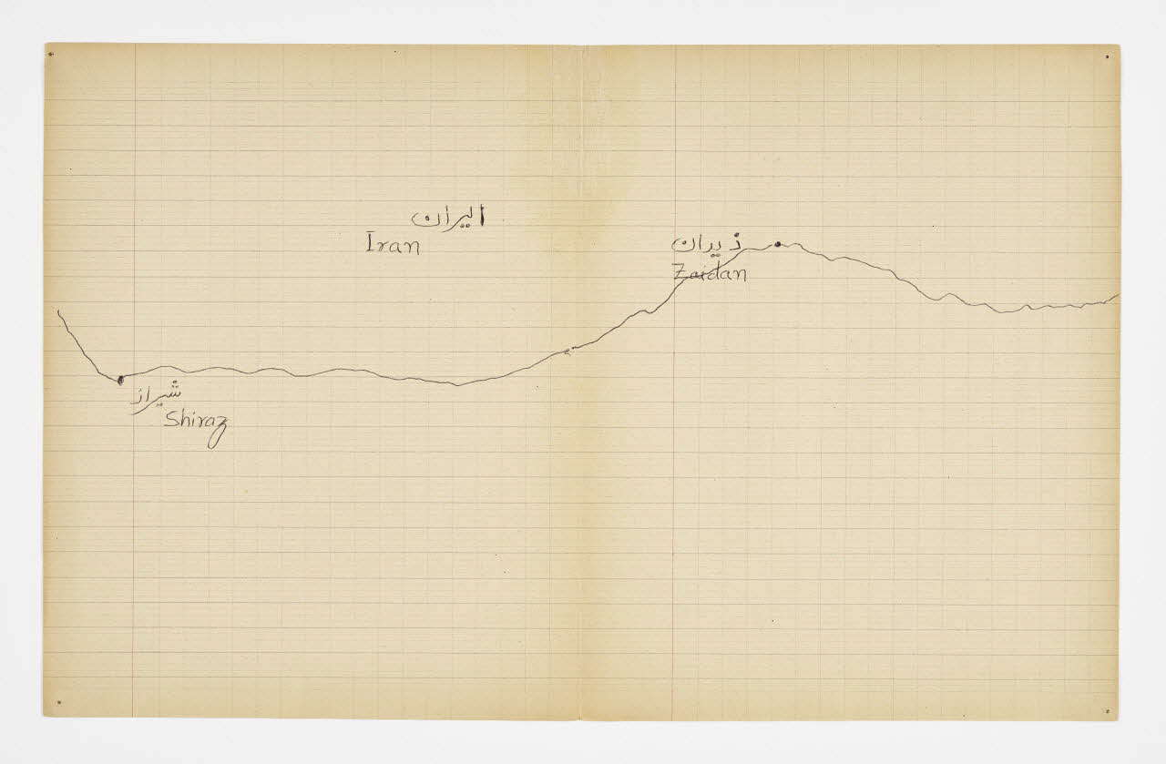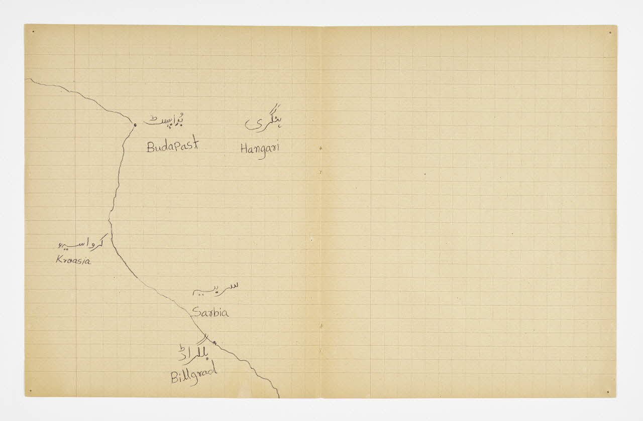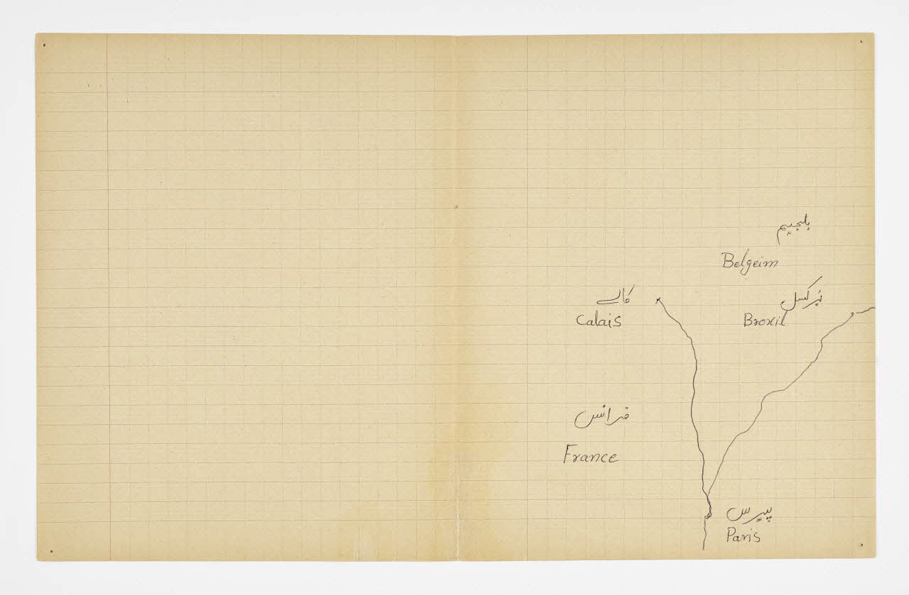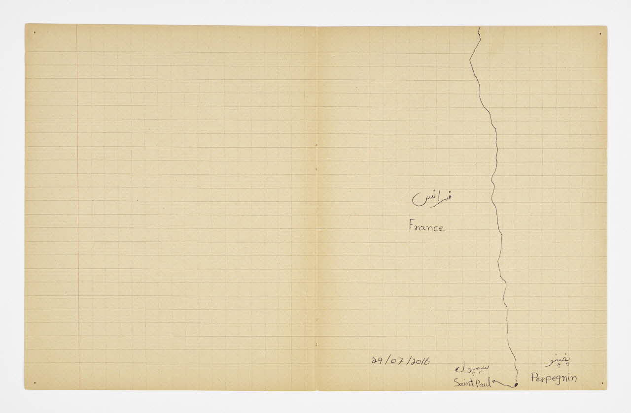 Lieu : Saint-Paul-de-Fenouillet, Pyrénées-Orientales, Occitanie, FranceDate : 2016Mathieu Pernot a acheté sur un marché aux puces un vieux cahier d'écolier lui rappelant son enfance, sur lequel il a invité Imdad Hussain à retracer l'itinéraire de sa migration depuis Khyber (Pakistan) jusqu'à son arrivée en France. Pour ce faire, il a tracé son itinéraire sur les feuilles de cahier d'après la carte du monde qui était projetée dessus. Réalisé à Saint-Paul-de-Fenouillet dans une structure d'hébergement pour migrants. Ce projet de co-création a été mené lors de la résidence de l'artiste au mémorial du camp de Rivesaltes (Pyrénées-Orientales) en 2016.
