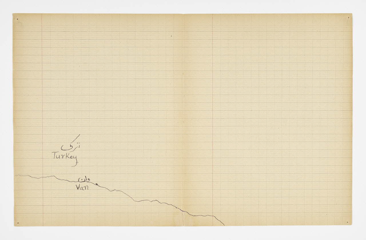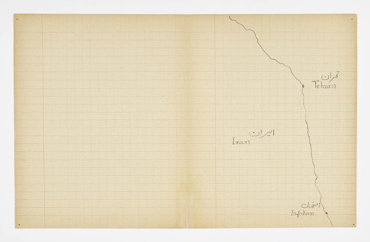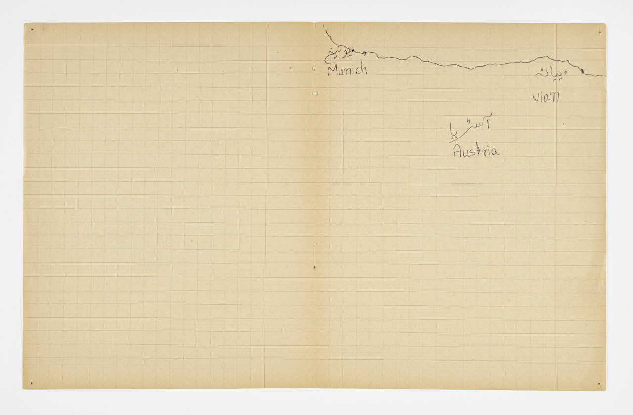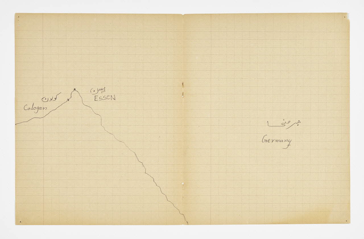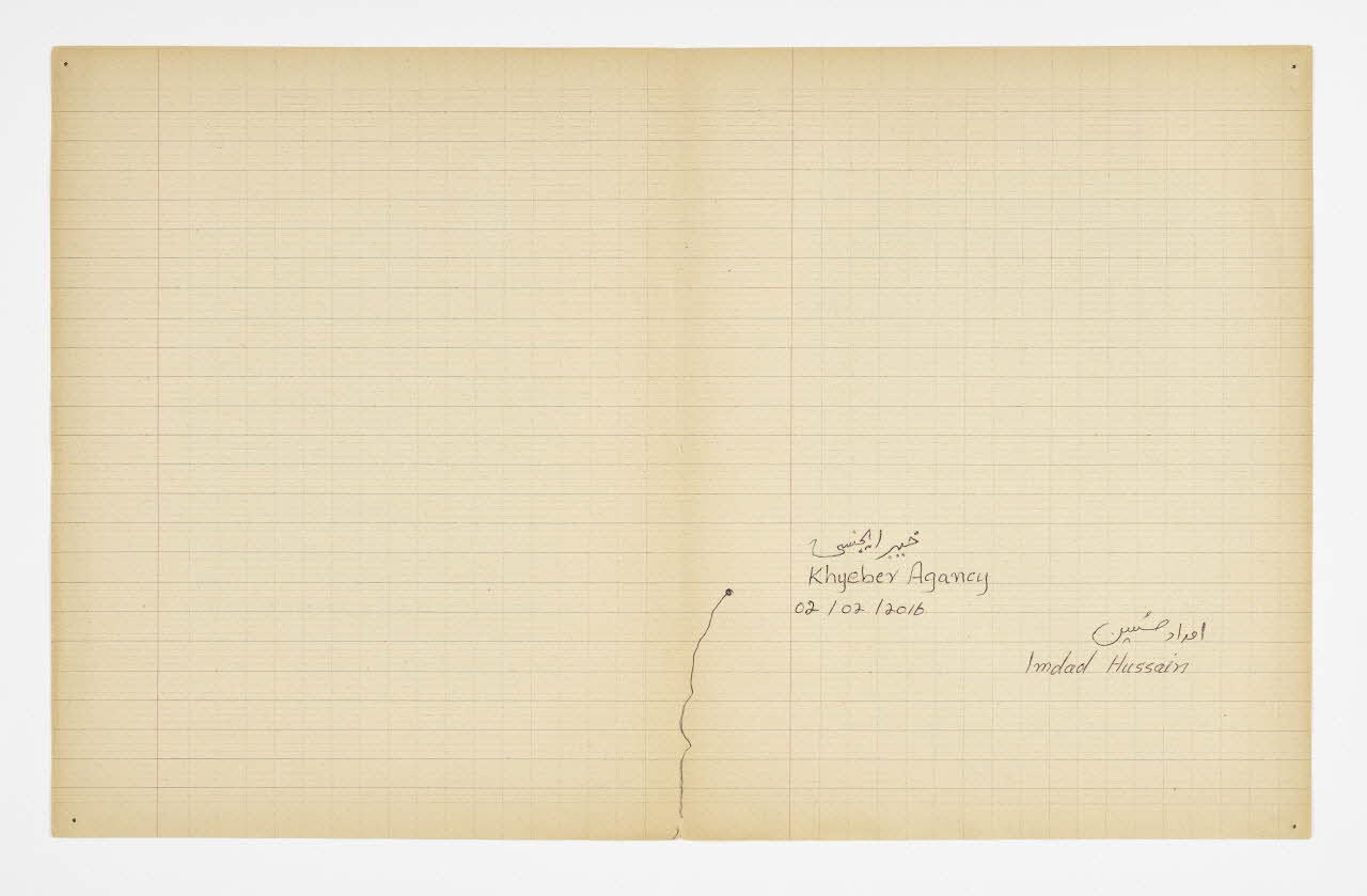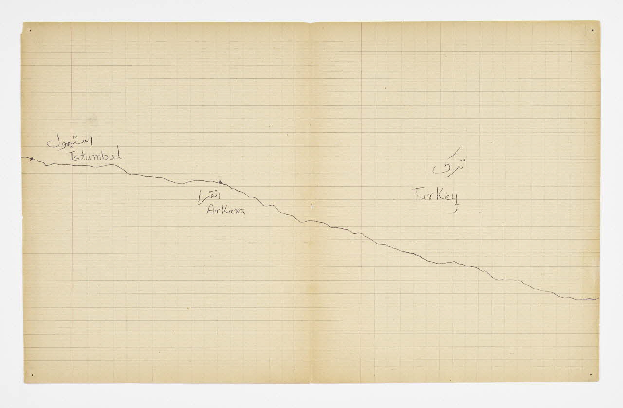 Lieu : Saint-Paul-de-Fenouillet, Pyrénées-Orientales, Occitanie, FranceDate : 2016Mathieu Pernot a acheté sur un marché aux puces un vieux cahier d'écolier lui rappelant son enfance, sur lequel il a invité Imdad Hussain à retracer l'itinéraire de sa migration depuis Khyber (Pakistan) jusqu'à son arrivée en France. Pour ce faire, il a tracé son itinéraire sur les feuilles de cahier d'après la carte du monde qui était projetée dessus. Réalisé à Saint-Paul-de-Fenouillet dans une structure d'hébergement pour migrants. Ce projet de co-création a été mené lors de la résidence de l'artiste au mémorial du camp de Rivesaltes (Pyrénées-Orientales) en 2016.