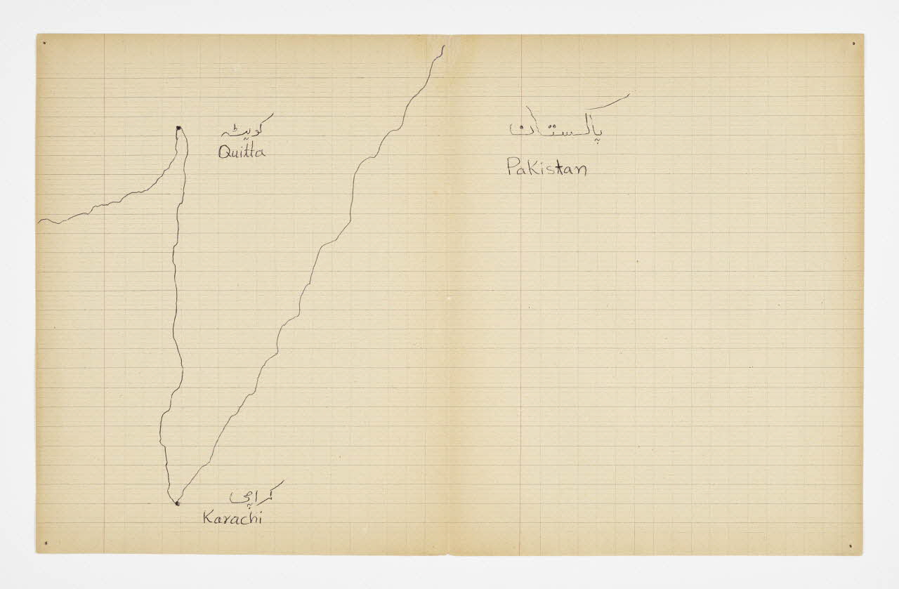 Doubles pages de cahier juxtaposées de manière à rendre visibles, tracées au stylo-bille, la trajectoire de migration d'Imdad Hussain depuis Khyber (Pakistan) jusqu'en France. Deux couvertures de cahiers d'écolier de couleur bleue et orange rytment la composition.Matériaux et techniques