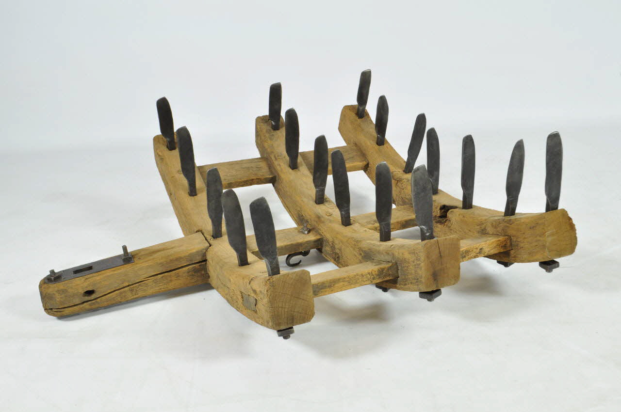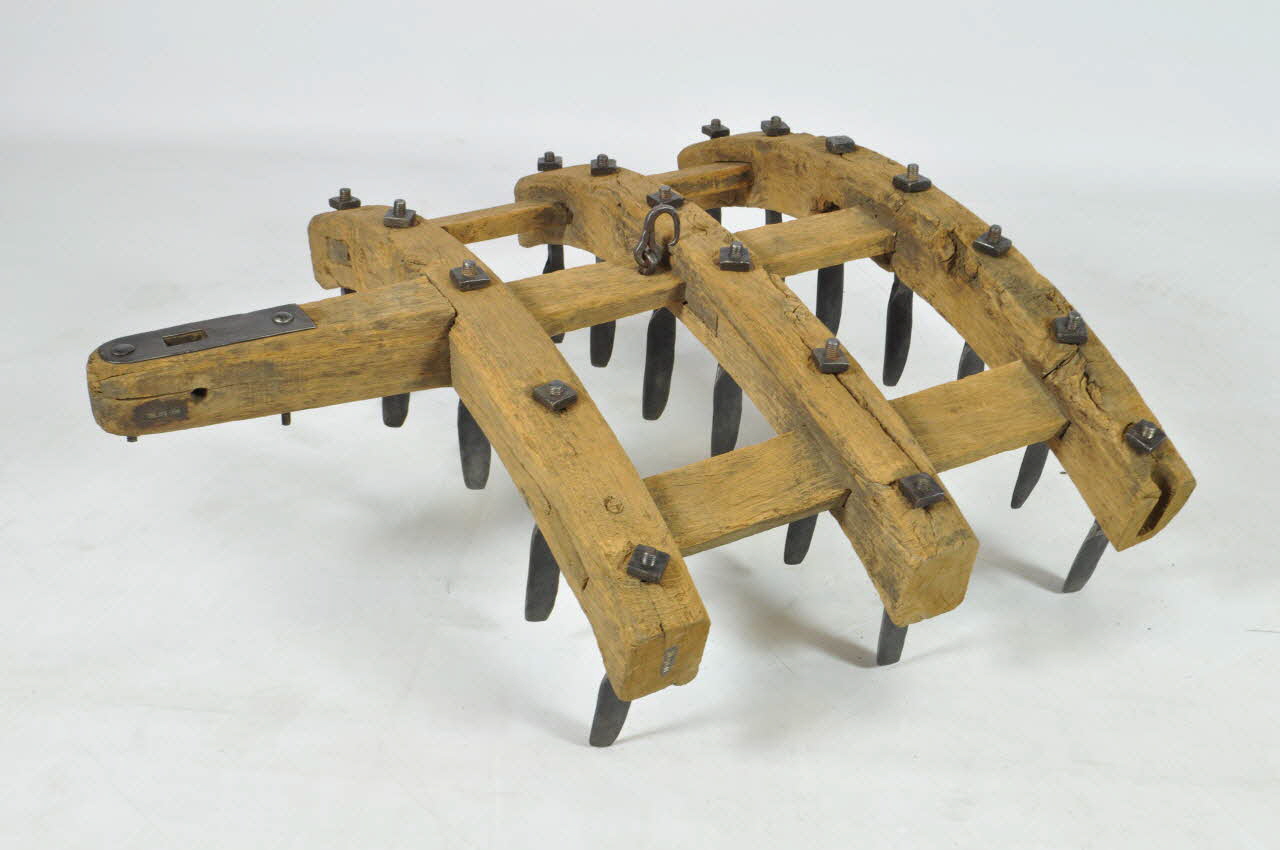 Herse composée de trois poutres de bois brut, à section carrée, courbées et réunies par trois traverses perpendiculaires dont une, centrale, prolongée par un manche et munie d'un anneau de fer en son centre.