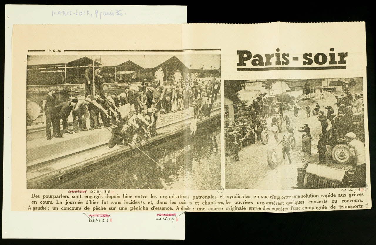 - Scène : ouvrier, Front populaire, grève, usine, pêche à la ligne