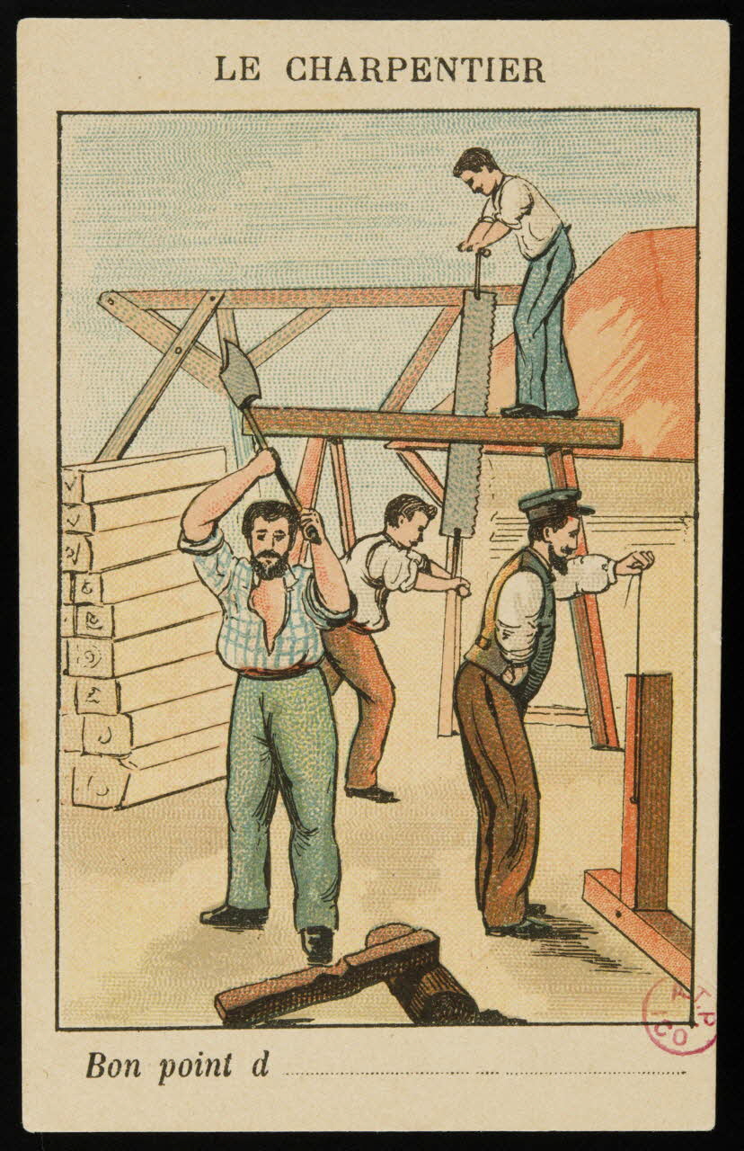 - Scène : charpenterie, débitage, hache, sciage, scie, homme, outil : vérification
