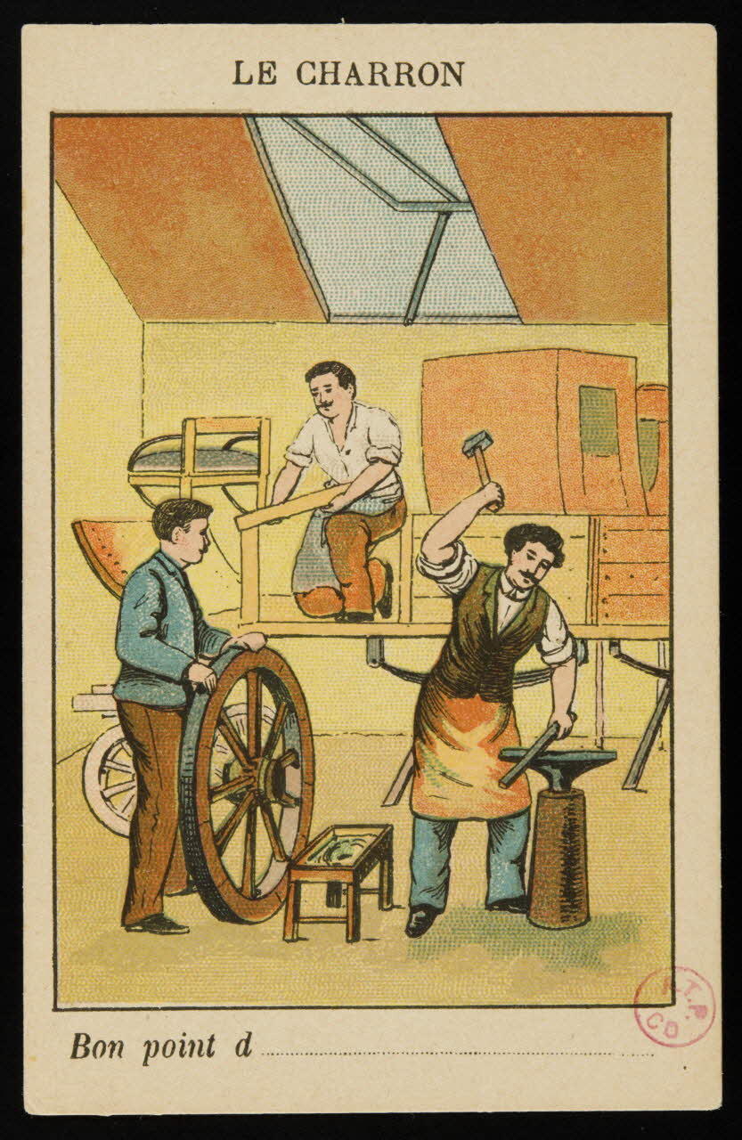 - Scène : charronnage, voiture à attelage, homme : roue, travail du métal