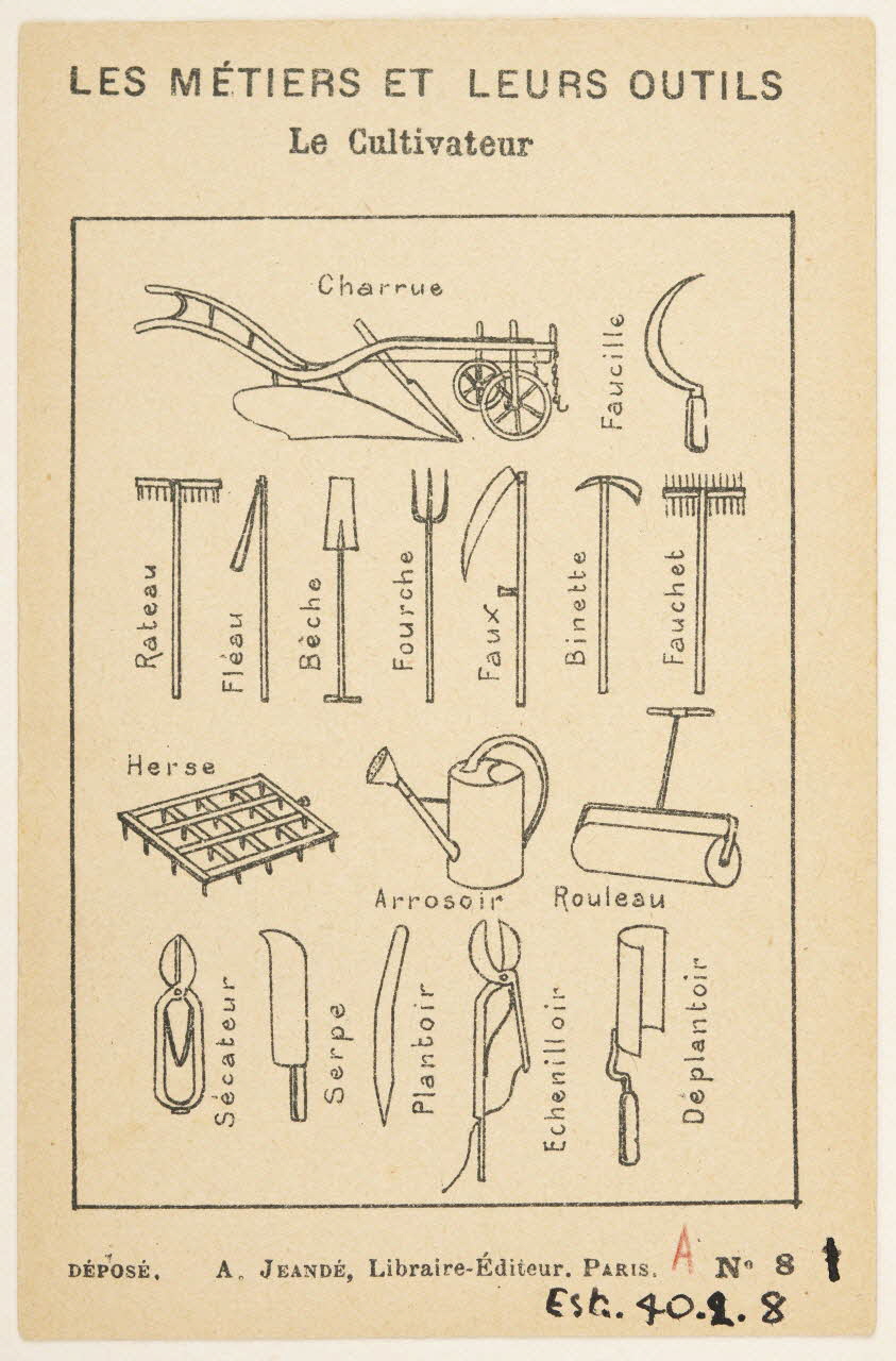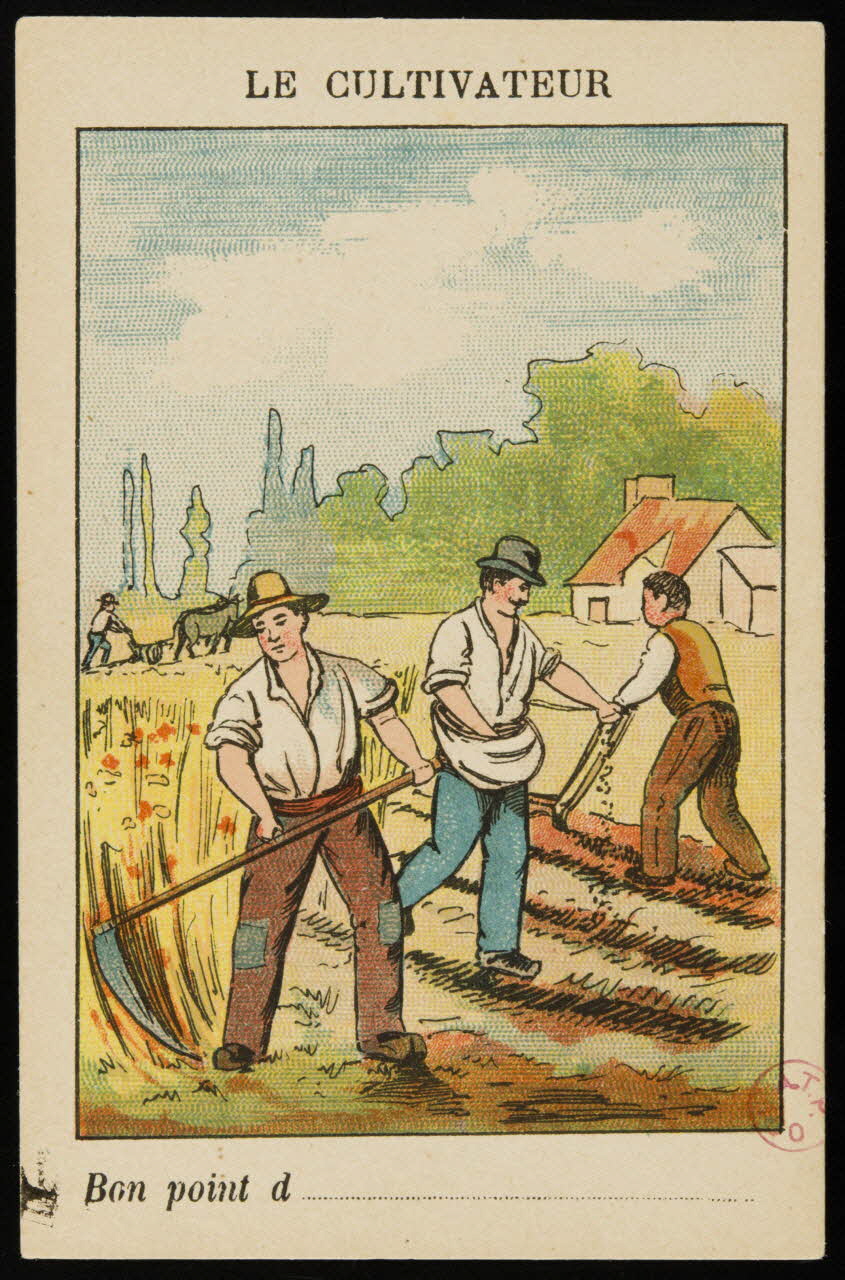 - Scène : champ, homme, fauchage, faux, semailles, labour