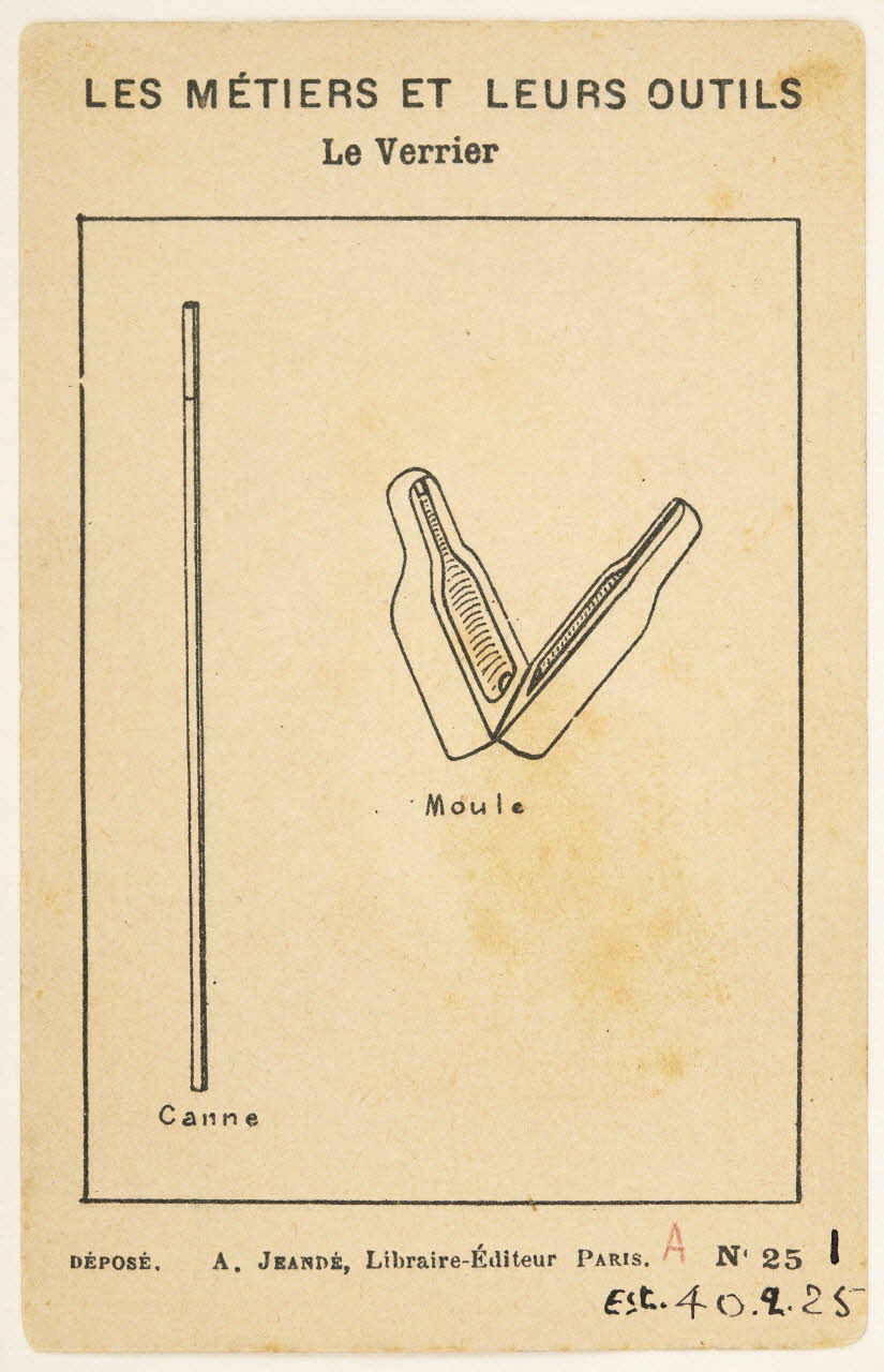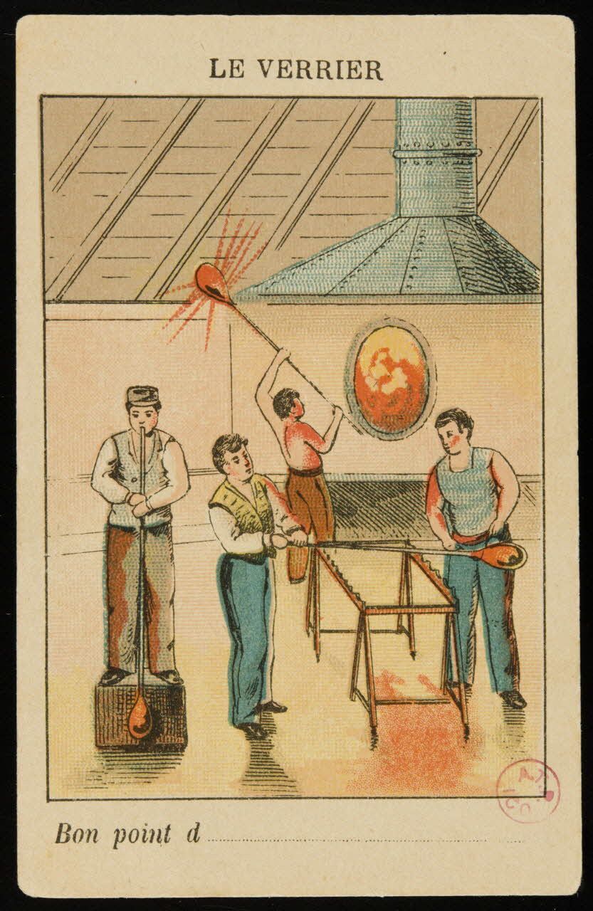 - Scène : homme, industrie du verre, souffle, fourneau