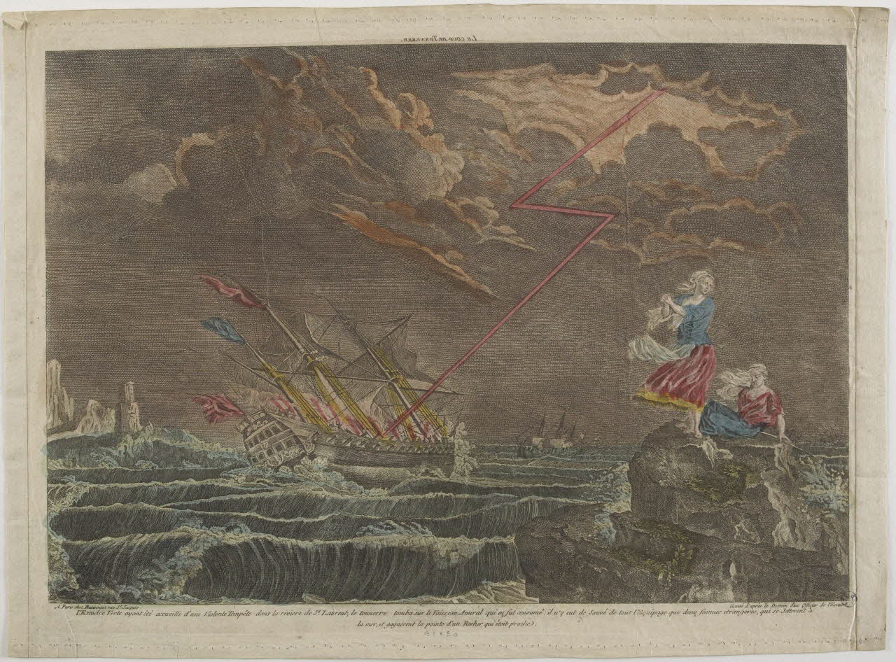 Scène de tempête : la foudre tombe sur le vaisseau Amiral de la flotte française sur le Saint-Laurent, seules deux rescapées sur leur rocher regardent le drame, au désespoir.Inscriptions