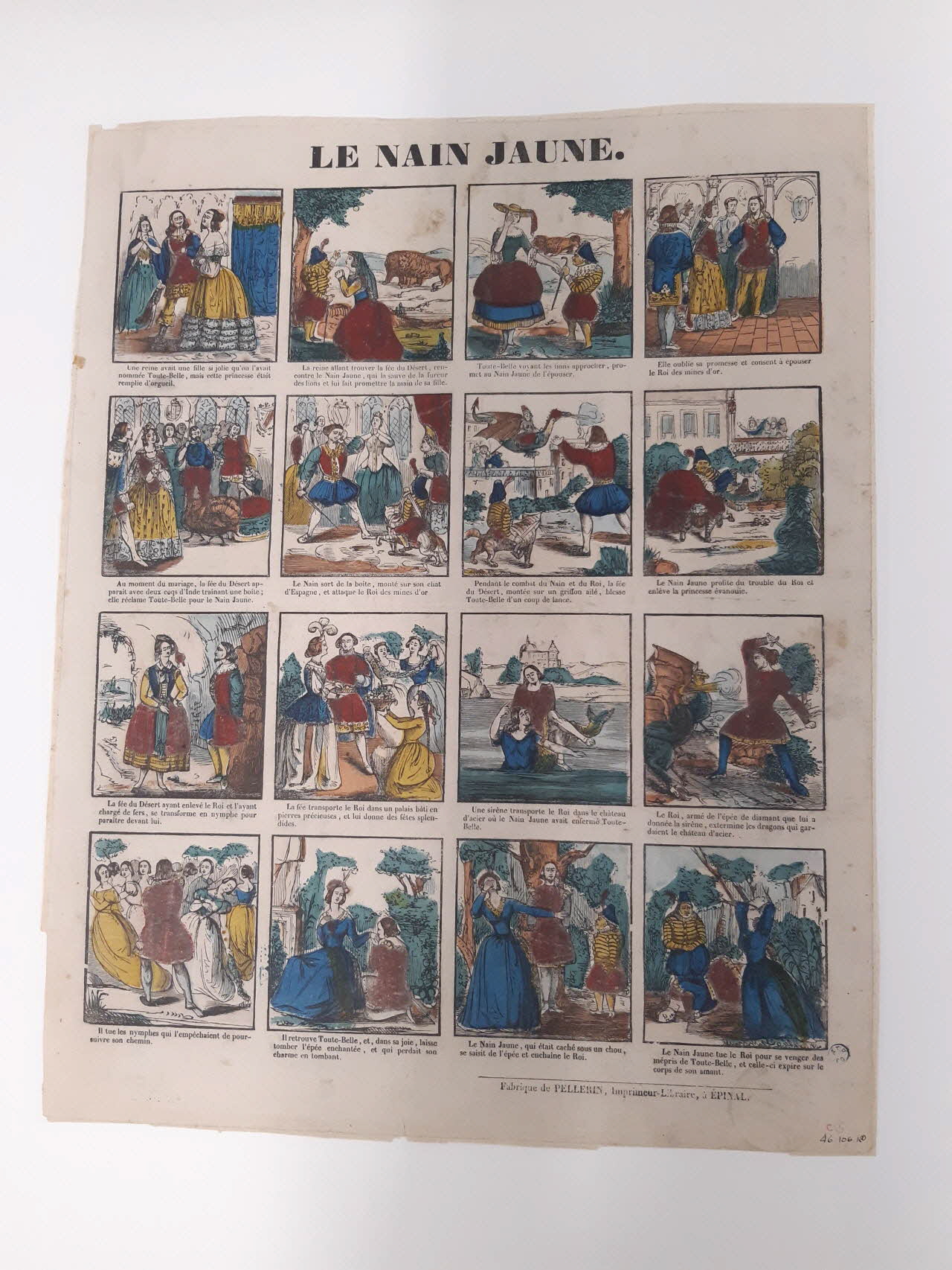 - Suite de scènes : cycle narratif, princesse imaginaire, roi, reine, nain, lion, mariage, dindon, chat, duel, dragon, fée, enlèvement : princesse imaginaire, évanouissement, Nymphe, sirène poisson, couple, meurtre, cadavre : roi, désespoir : princesse imaginaire