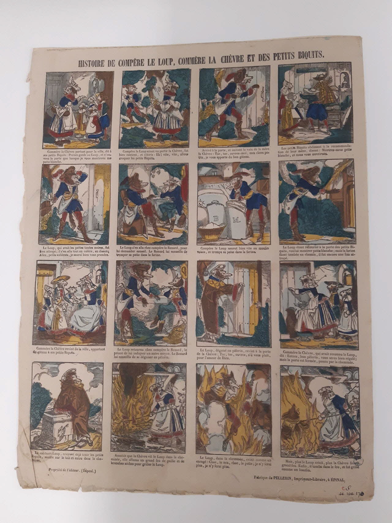 (Fabrique de PELLERIN, Imprimeur-Libraire, à ÉPINAL. (b. d.))(Commère la Chêvre partant pour la ville, dit à ses petits Biquits (h. g.) [...] Enfin, il tomba dans le fue, et fut grillé comme un boudin. (b. d.))Décor