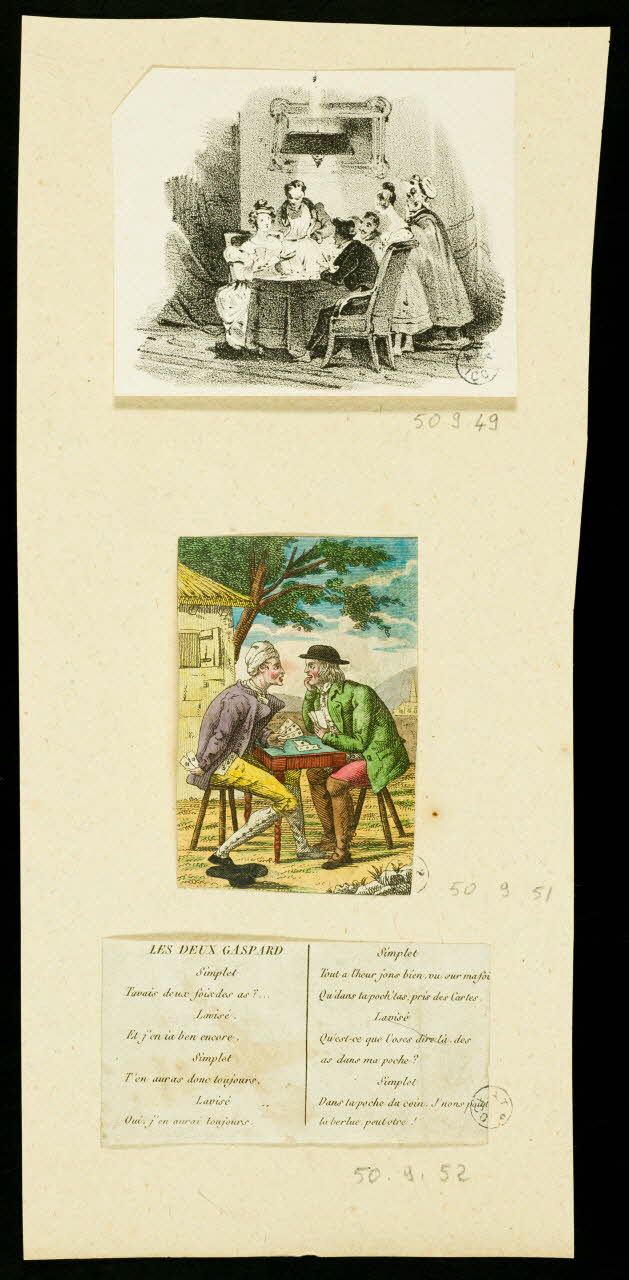 - Scène : salon, bourgeoisie, chaise, lustre, homme, femme, jeu de cartes, vêtement : bourgeoisie : époque 19e siècle
