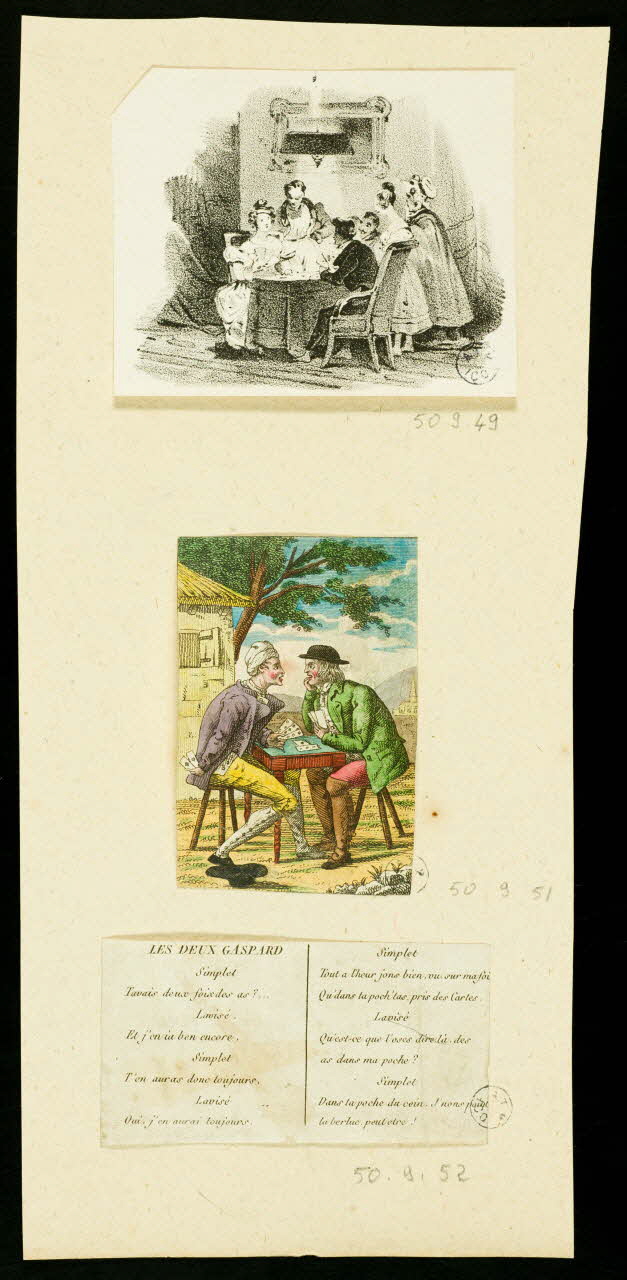 - Scène : homme, jeu de cartes, table, vice, arbre, chaumière