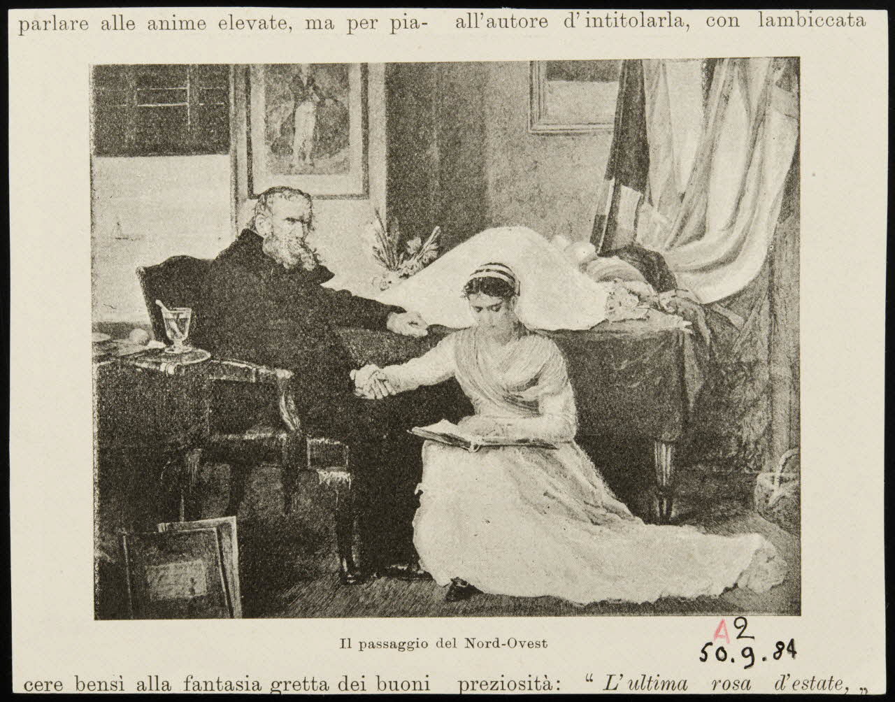 - Revers : scène : vue d'intérieur, homme : assis, femme, livre