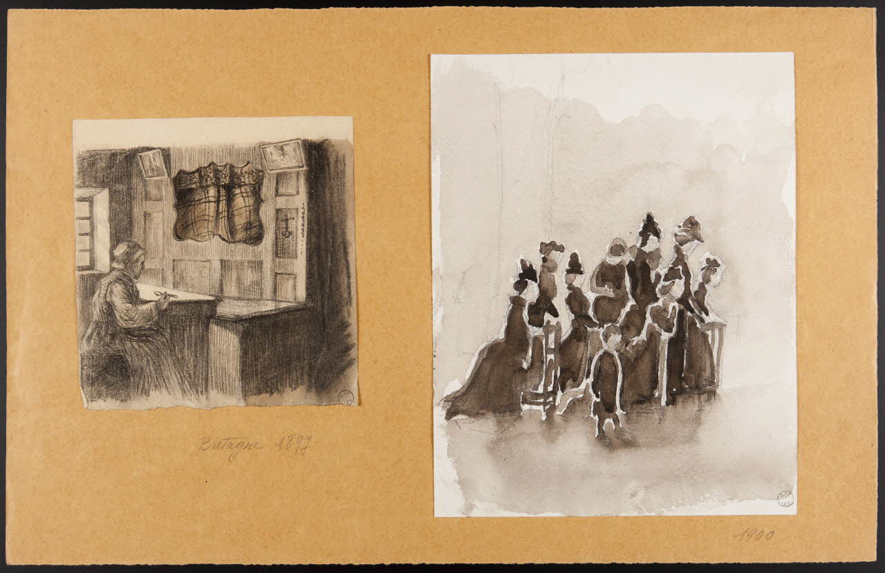 dessin, Groupe de femmes agenouillées dans une église
