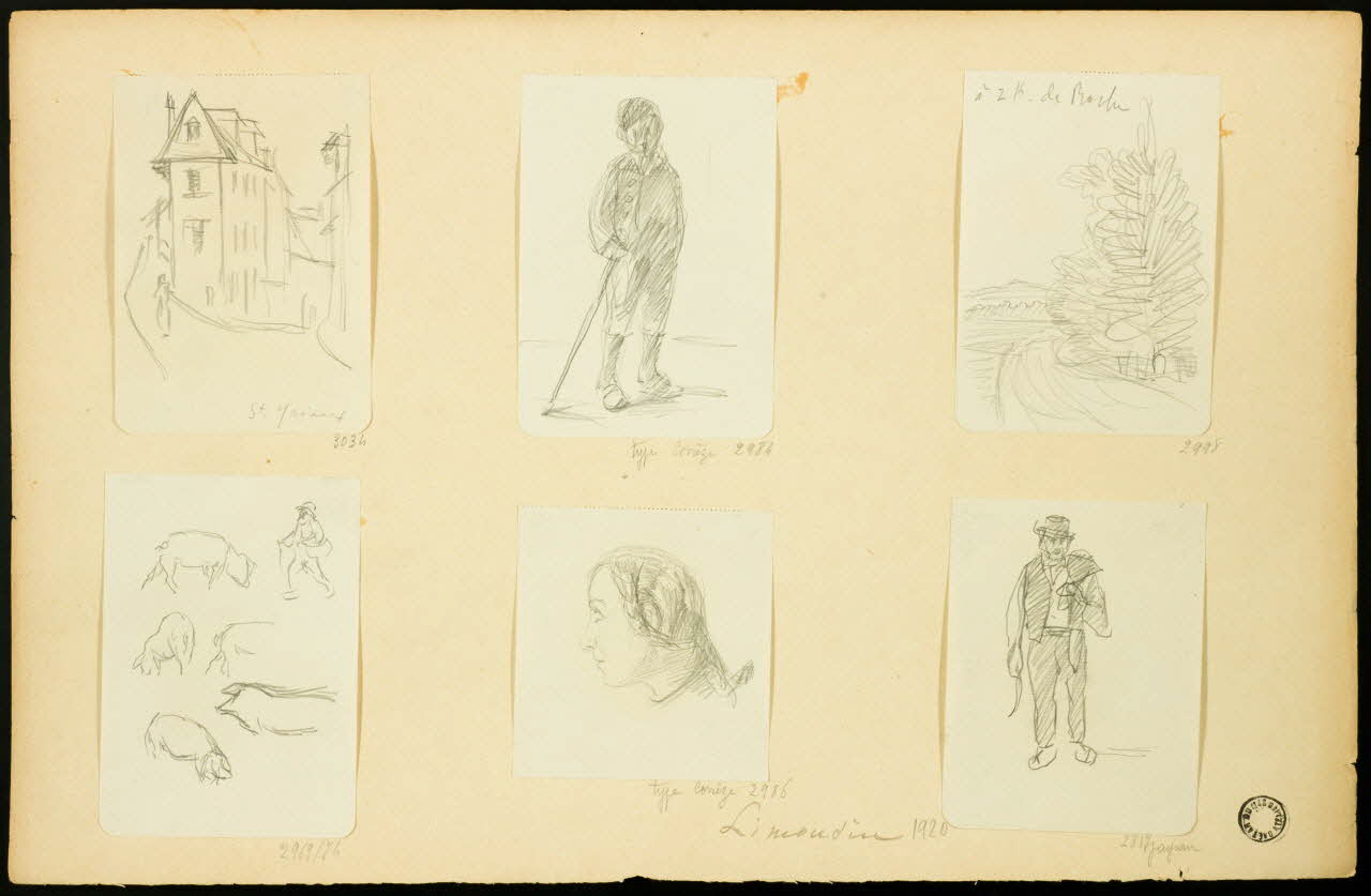 (ATELIER GAETAN DUMAS (cachet circulaire) / Limousin 1920 / 2817 paysan (mine de plomb, face montage))Inscription (revers)