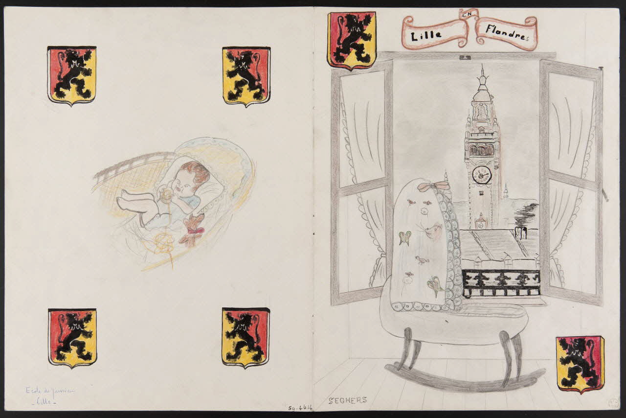 - Vue d'intérieur : chambre, berceau, fenêtre : ouvert