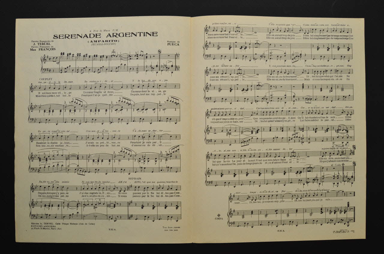 Sur la couverture, représentation d'une femme en buste, accoudée, à l'arrière-plan, cow-boy jouant du bonjo assis sur une barrière. Les inscriptions renseignent le titre de la chanson, le nom des auteurs et de l'éditeur. A l'intérieur, partition et paroles de la chanson. Au dos, le logo des éditions Andorra.Matériaux et techniques