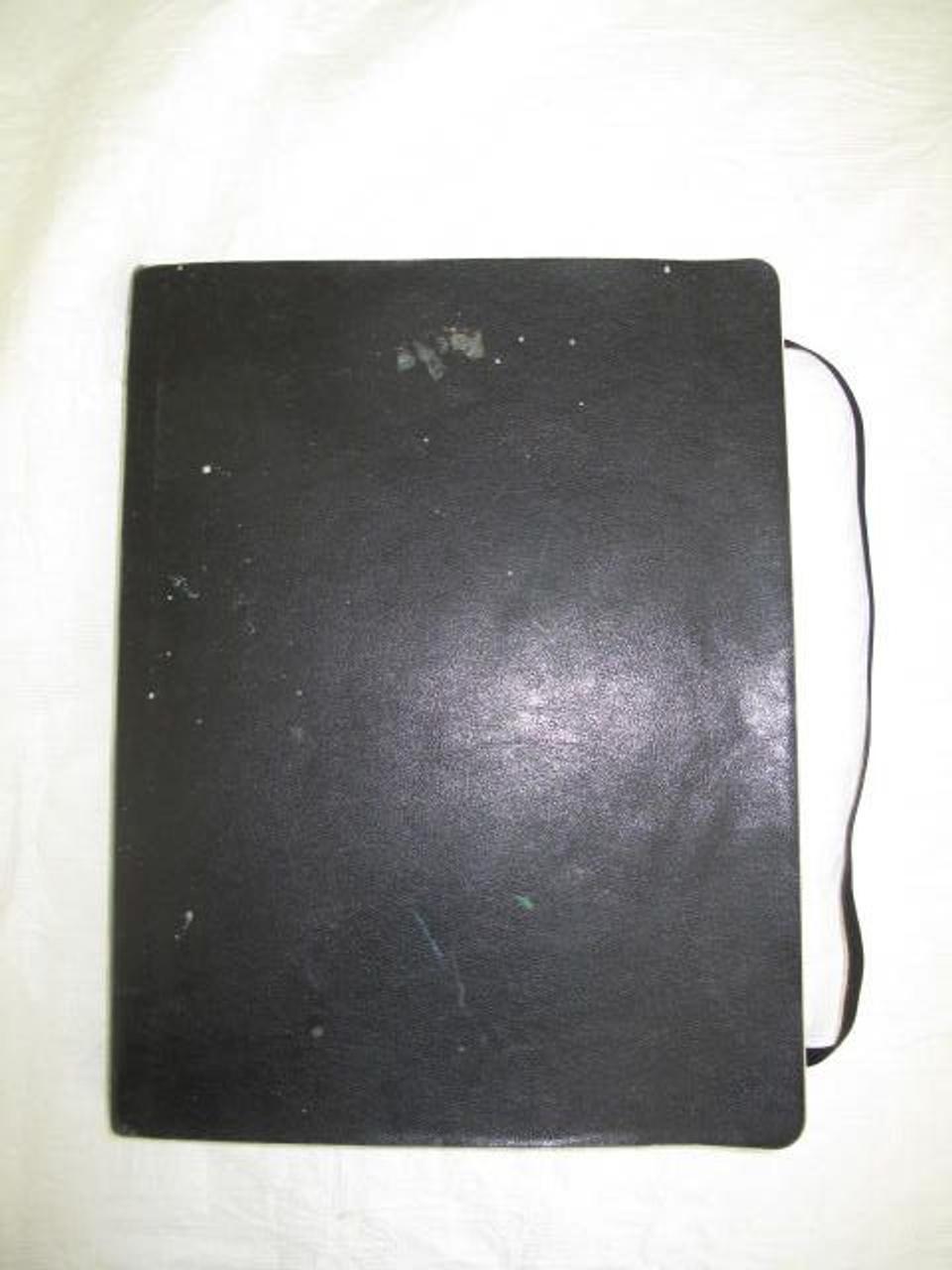 Cahier de croquis couvert de simili-cuir synthétique souple et noir, dont les pages peuvent être maintenues fermées par un elastique également noir.