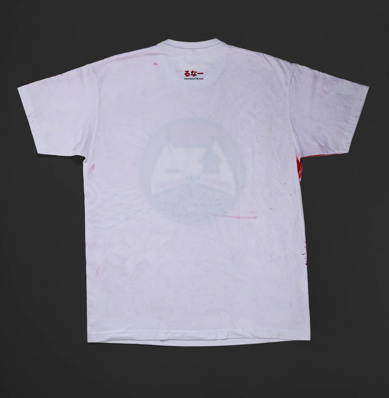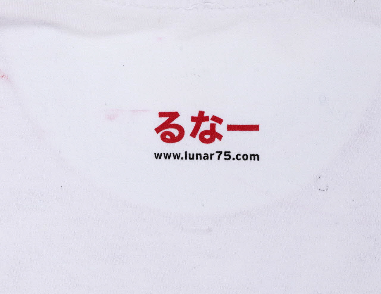 Tee-shirt blanc sur le devant duquel est sérigraphié en noir et rouge le chat logotypique dont Lunar a fait son emblème.