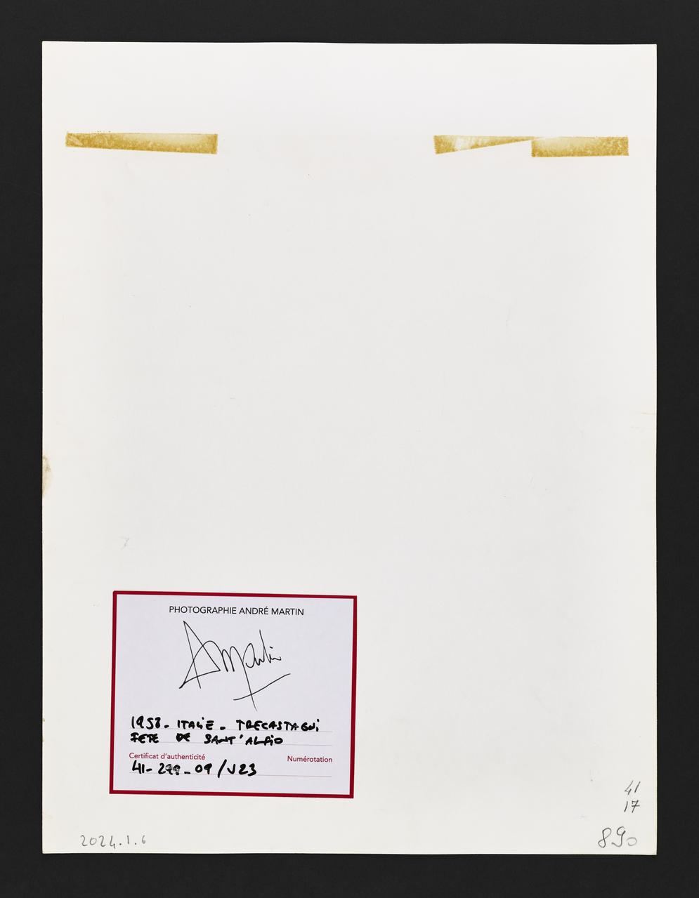 Photographie André Martin / André Martin / 1958 - Italie - Trecastagni Fête de sant'Alfio / Certificat d'authenticité / Numérotation / 41.299.09/V23 (étiquette), au reversInscription votive