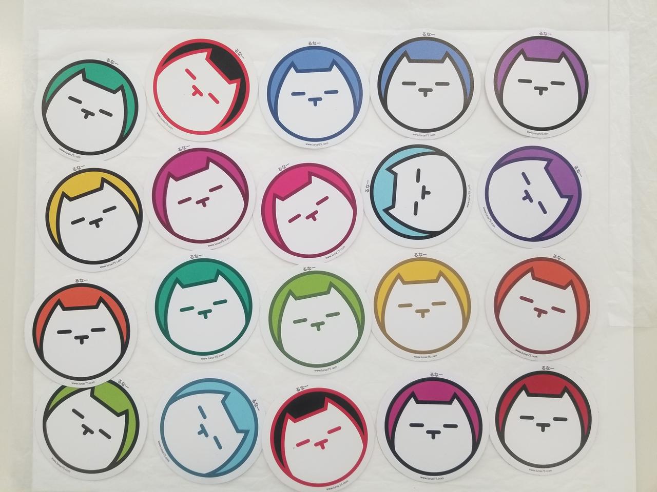 Ensemble de 20 autocollants présentant le chat logotypique dessiné et développé sur de nombreux supports par Lunar.