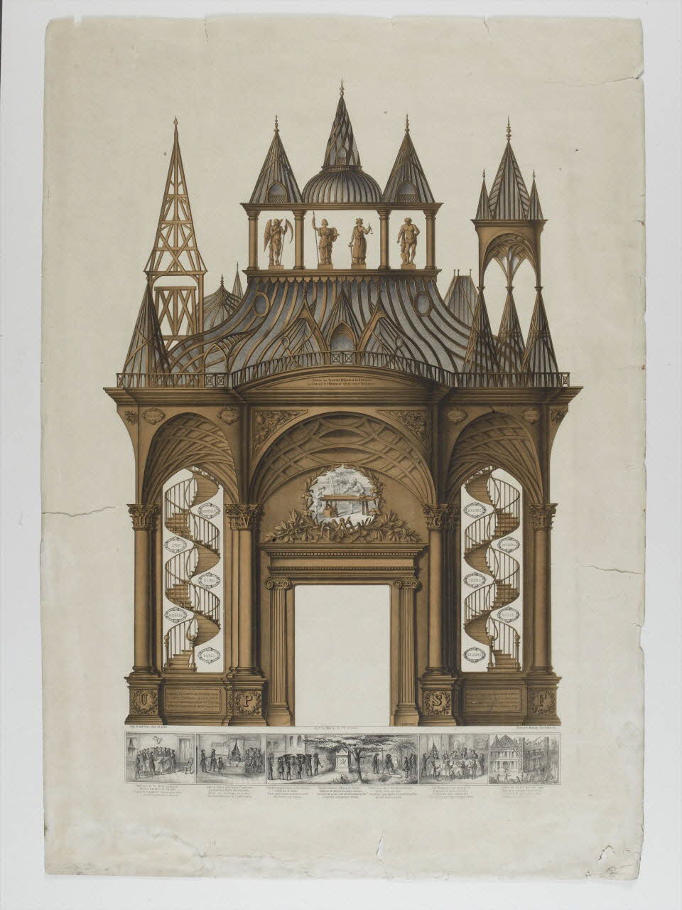 - Vue d'architecture : dôme, escalier, colonne, charpente, ornementation : couronne : laurier, ornementation : outil : charpenterie, statue : allégorie : mort, statue : allégorie : justice, statue : femme : lance, statue : Hercule