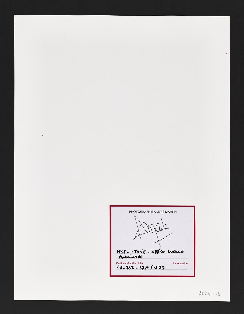 De :André Martin est un photographe ethnologue français, artiste voyageur, dont l'œuvre se situe à la rencontre entre ethnographie et production artistique. Après une formation d’opérateur audio-visuel à l’école de Photographie et de cinéma de Vaugirard, il abandonne progressivement le cinéma pour la photographie. Dans les années 1950, il enchaîne de nombreux voyages à travers le monde, poussé par son intérêt pour l’ethnologie : au Mali d’abord aux côtés de l’ethnologue Marcel Griaule, en Indonésie avec Pierre Ivanoff en 1953, en Espagne en 1955-56 et dans le Sud de l’Italie en 1958. Il rapporte de ses voyages des séries de photographies documentaires, témoignant de ses observations au cours de ses séjours.