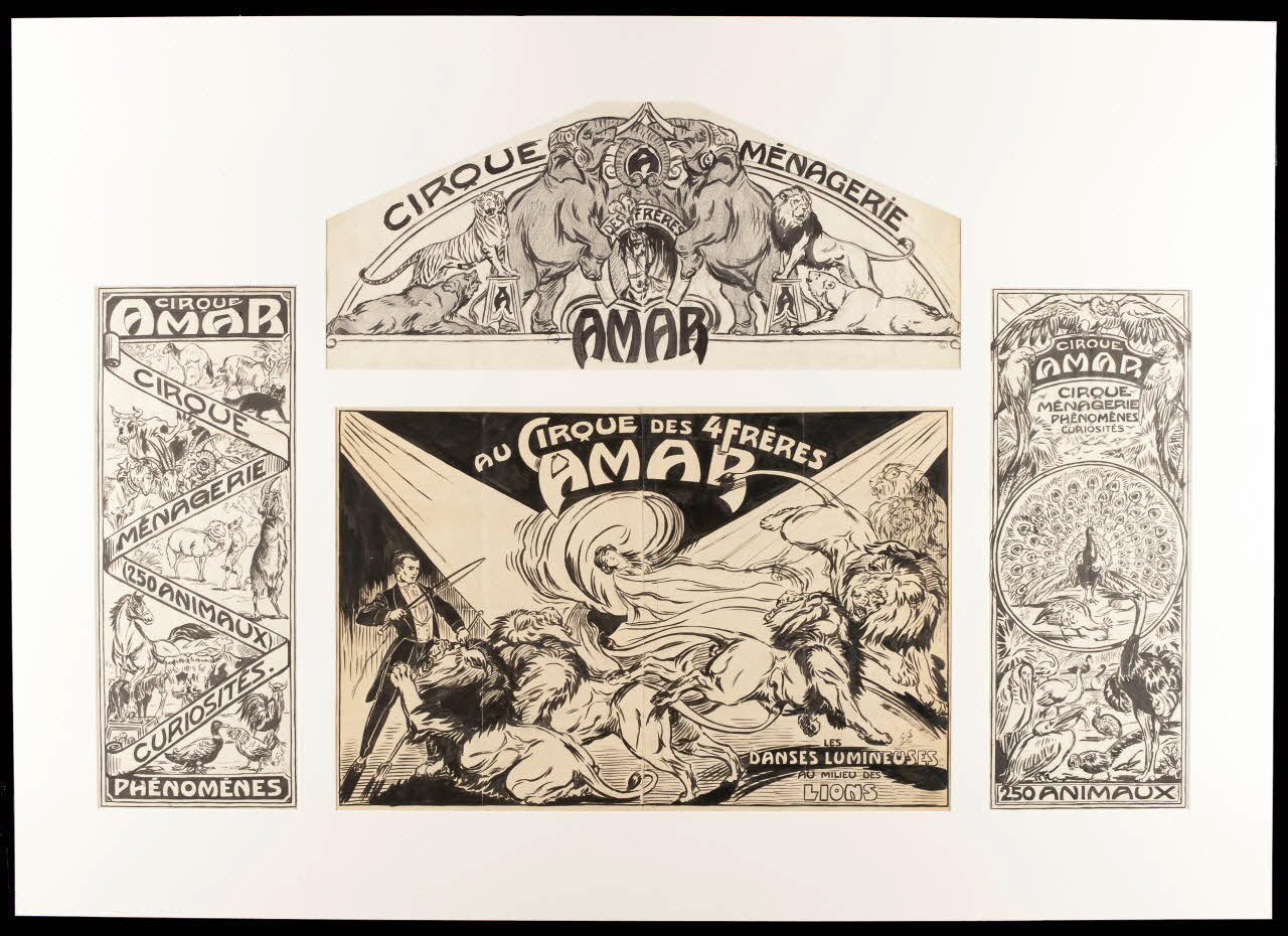 (G. S. (M. m. d., encre noire, plume))((février 1925) (h. g., encre noire, plume))(CIRQUE AMAR (réserve) CIRQUE / MENAGERIE / PHENOMENES / CURIOSITES / 250 ANIMAUX (pinceau, encre noire))Décor