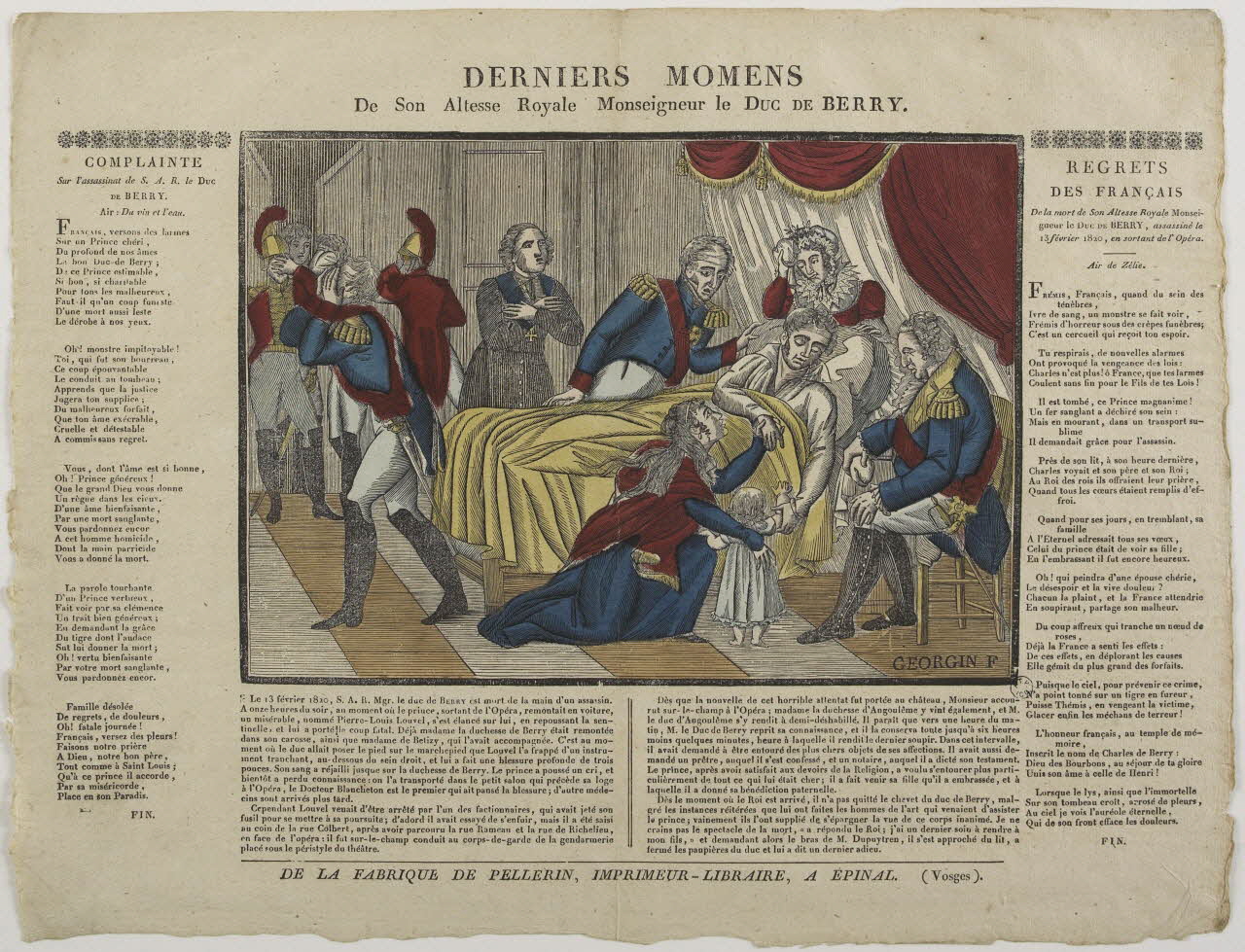 (Le 13 février 1820, S. A. R. Mgr. le duc de BERRY est mort de la main d'un assassin. (...) il s'est approché du lit, a / fermé les paupières du duc et lui a dit un dernier adieu. (b. m.))Complainte