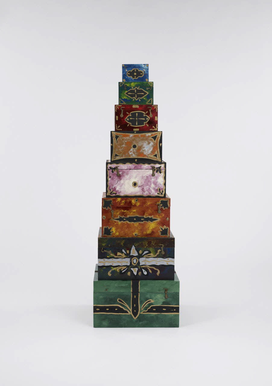 Série de huit boîtes gigognes en bois, fabriquées et peintes en couleurs par Yanco.Matériaux et techniques