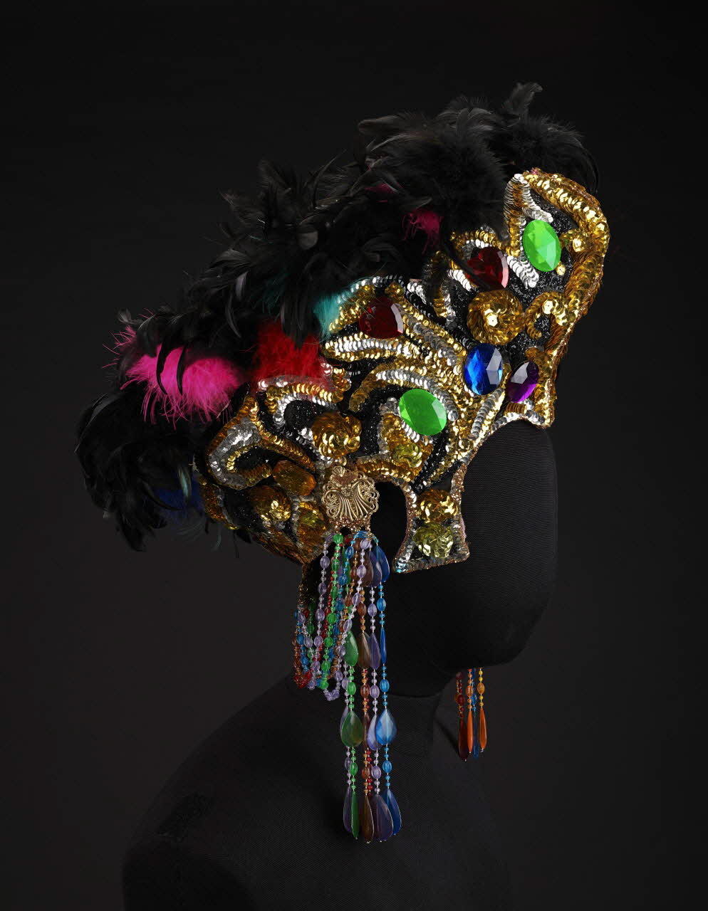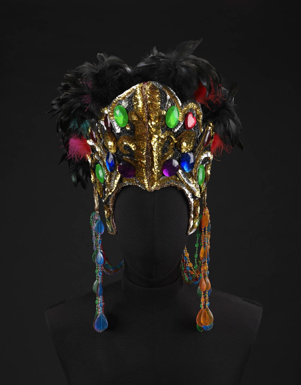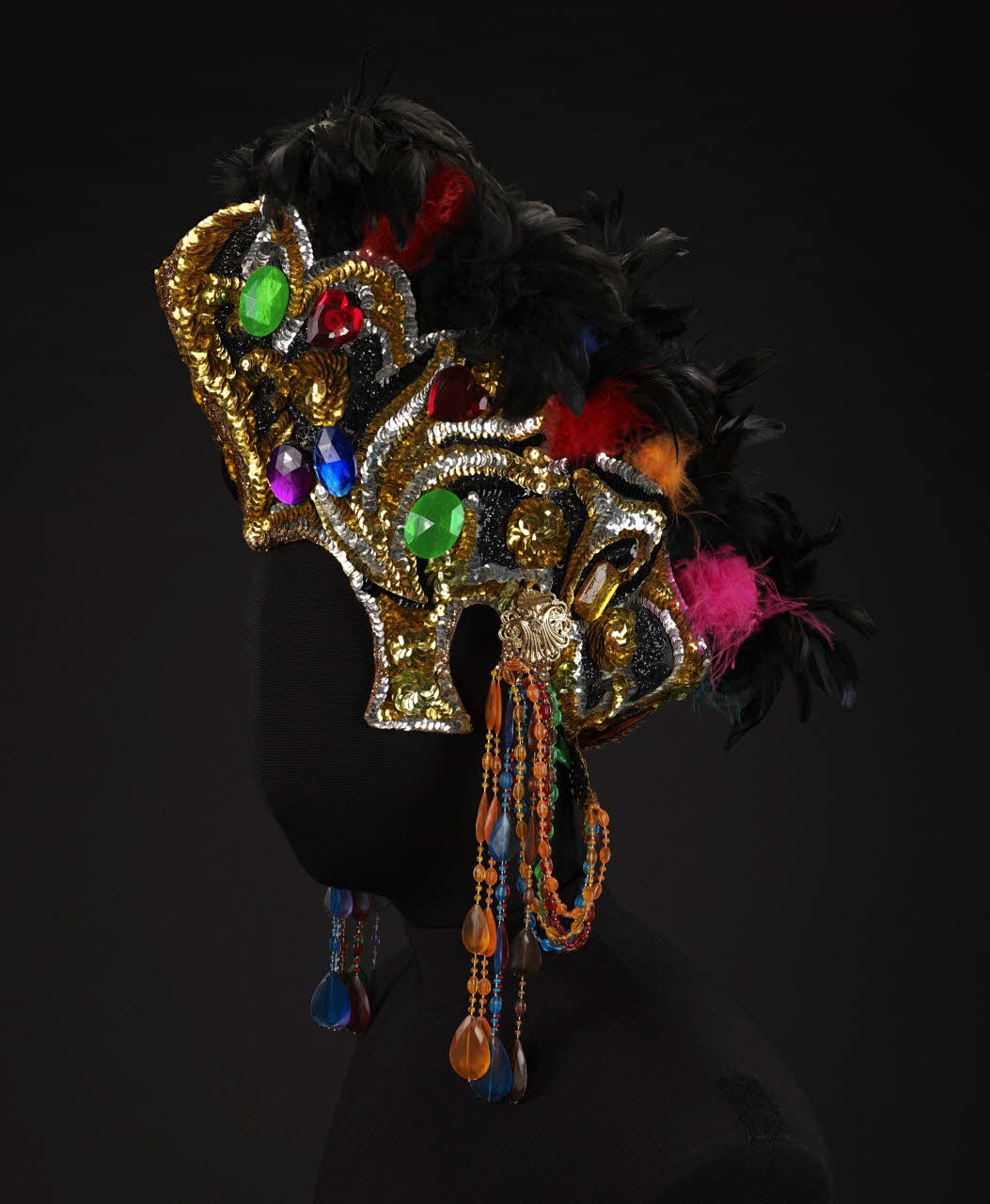 Coiffe de mage en casque entièrement décoré, à la manière d'une coiffe de carnaval de Rio. La structure est conformée au crâne au moyen de mousse et de fil de fer torsadé. Ornementation rayonnante autour du visage, et plumes noires à l'arrière du crâne. Décor de sequins majoritairement dorés, argentés et noirs. Pendeloques colorées partant des tempes, rattachées à quatre breloques dorées égyptisantes, en rosettes et palmettes, fixées au casque structurel par du fil de coton. Plumes piquées et collées : plumes de type boa noir aux reflets irisés verts et plumes imitant celles de l'autruche colorées en bleu canard, bleu outremer, rose, rouge, orange.Matériaux et techniques