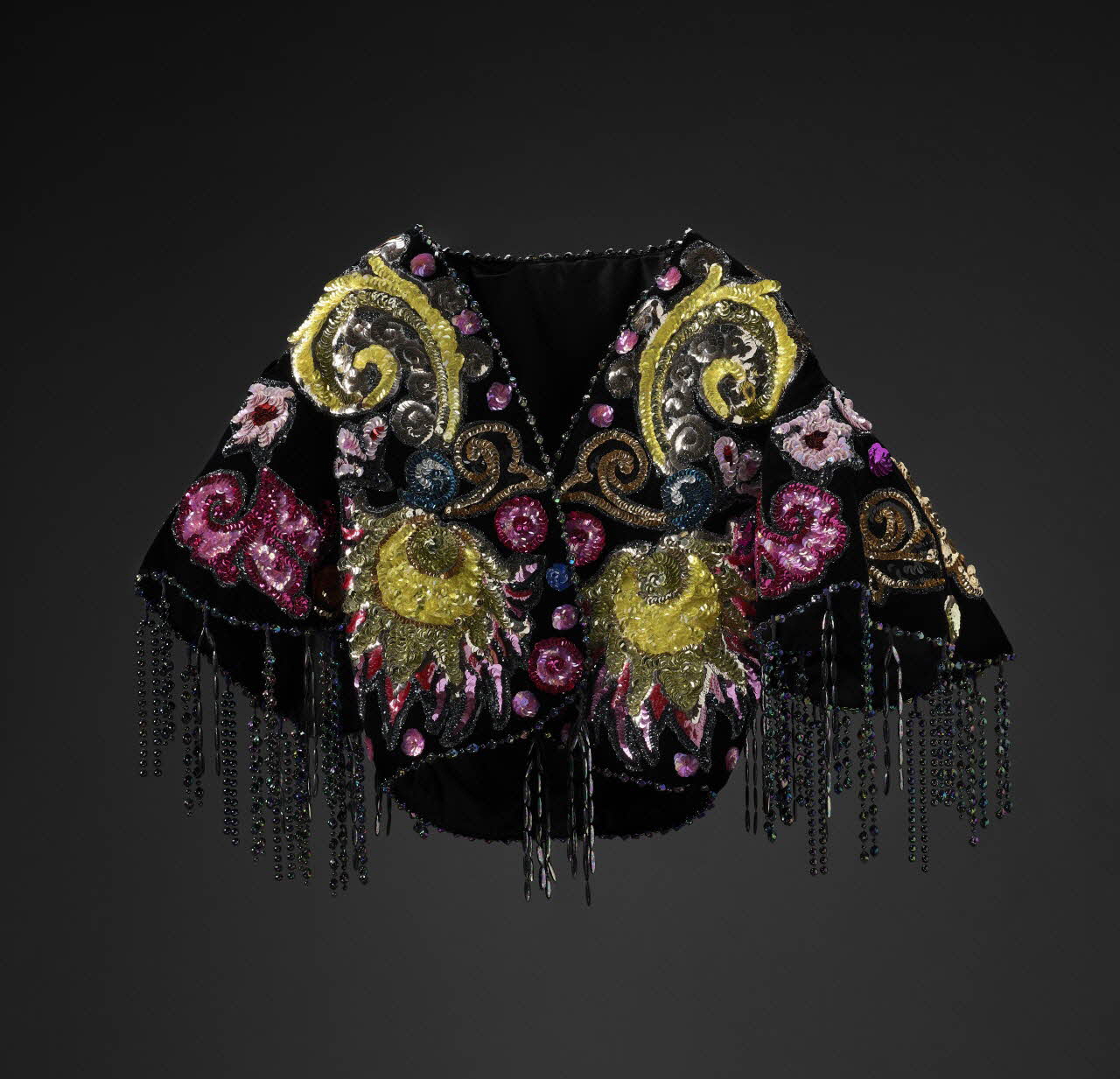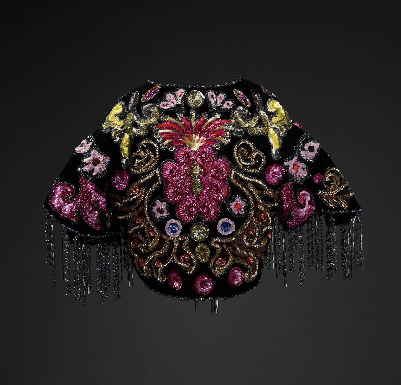 Veste bolero à emmanchure large et arrondie. En velours ras noir, doublure en satin noir. Décor symétrique baroque et sous-marin, brodé en sequins jaunes, dorés et nuances de roses, de perles en plastique aux reflets nacrés, dessinant des arabesques, des motifs cachemire, fleurs, coquillages, anémones de mer, conques et bulles. Ourlets de perles en plastique noires nacrées sur toute la bordure, en alternance de perles et pirouettes. Pendant des manches, des franges de perles noires nacrées longues de 14 à 17 cm par deux rangs de perles, oblongues et rondes.Matériaux et techniques