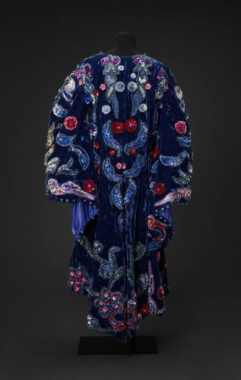 En velours bleu foncé, sur lequel sont cousus des morceaux de tissu découpés en arabesques, brodés de sequins en nuances de bleu (turquoise, canard, argenté) et rose (clair, fuschia, nacré) ; dessinant des motifs de cachemire, des rosettes rouges, des arabesques et coquelicots. Des paillettes bleues dissimulent les coutures. Le long des ourlets des manches et de l'ouverture devant, galon de perles boules bleu irisé de deux circonférences, moyennes et larges, interrompu dans le col. Doublure en satin bleu à reflets mauves.Matériaux et techniques