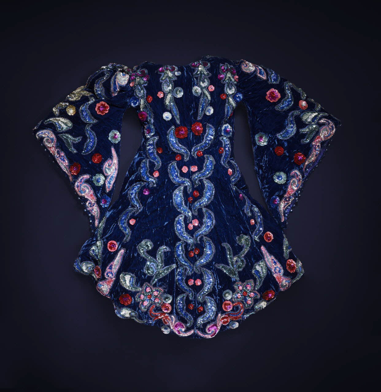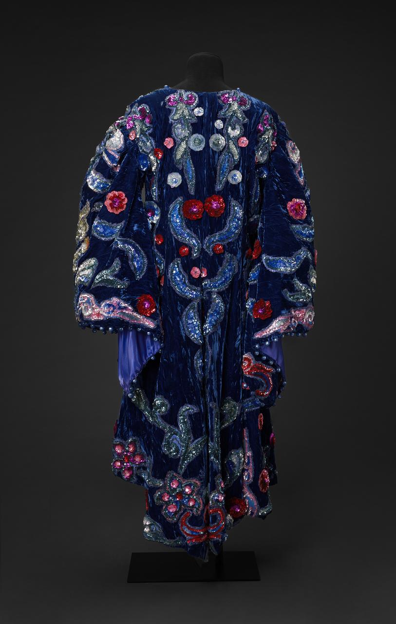 En velours bleu foncé, sur lequel sont cousus des morceaux de tissu découpés en arabesques, brodés de sequins en nuances de bleu (turquoise, canard, argenté) et rose (clair, fuschia, nacré) ; dessinant des motifs de cachemire, des rosettes rouges, des arabesques et coquelicots. Des paillettes bleues dissimulent les coutures. Le long des ourlets des manches et de l'ouverture devant, galon de perles boules bleu irisé de deux circonférences, moyennes et larges, interrompu dans le col. Doublure en satin bleu à reflets mauves. Le cintre associé au manteau est plein en bois contreplaqué vernis, portant au recto le nom Yanco en lettres capitales inscrites au feutre marqueur noir. Les contours du cintre au feutre marqueur noir avant la découpe de la planche sont encore visibles au verso.Matériaux et techniques