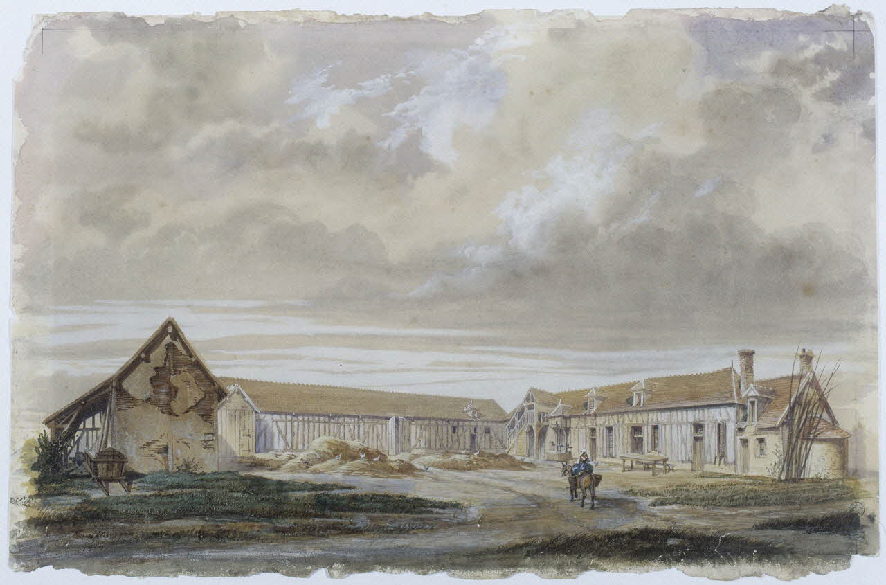 - Vue d'architecture : cour de ferme, fumier, pan-de-bois, femme, cheval, vêtement, régional, Centre
