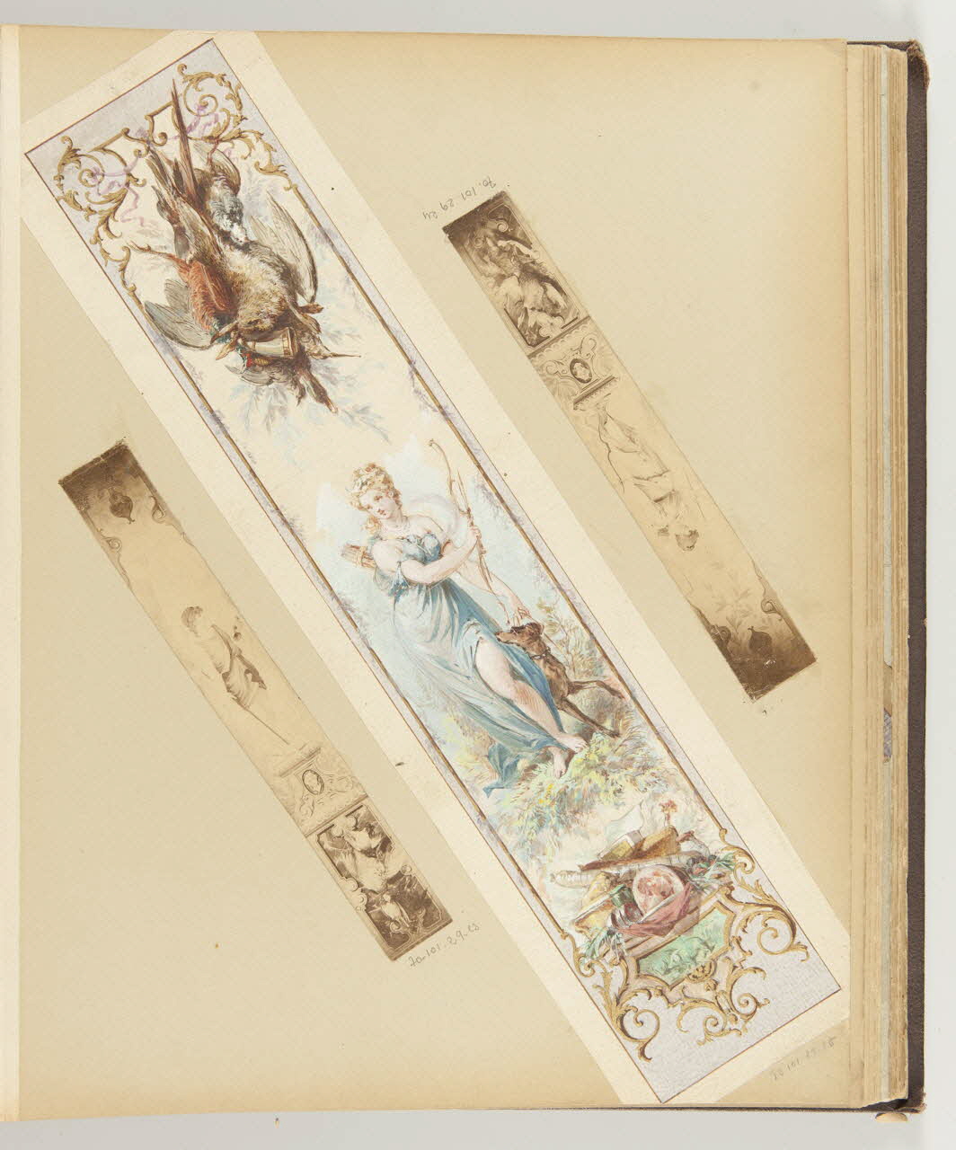 album, partie d'un ensemble de dessins et de photographies, Projet d'un panneau décoratif pour une charcuterie : Diane chasseresse et trophées de chasse