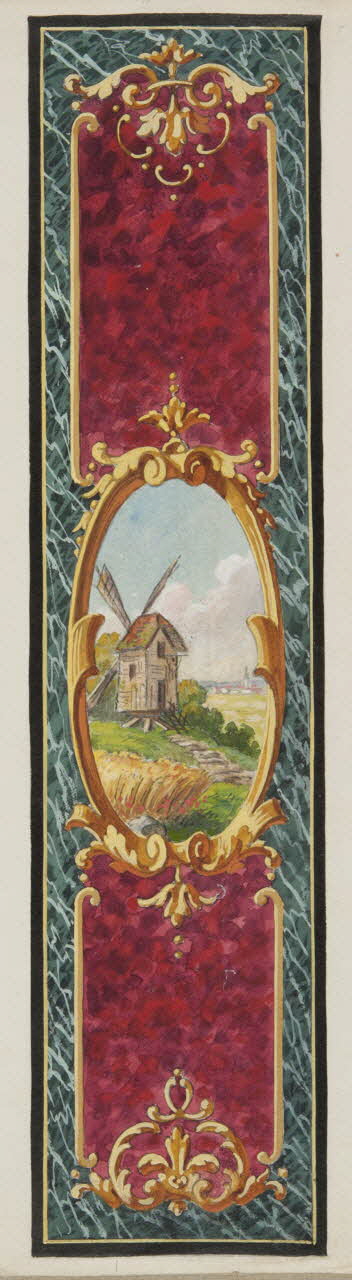 album, Projets de deux panneaux de charcuterie et de boulangerie : vase de fleurs avec trophée de gibiers et paysage avec moulin à vent