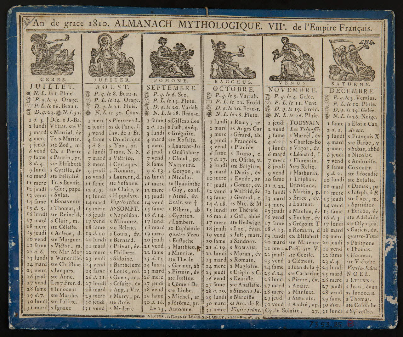Almanach mythologique imprimé recto verso pour l'année 1810. Avec la représentation des allégories Junon, Mercure, Diane, Mars et Apollon pour les mois du premier semestre. Cérès, Jupiter, Pomone, Vénus , Bacchus et Saturne pour le second semestre.Décor