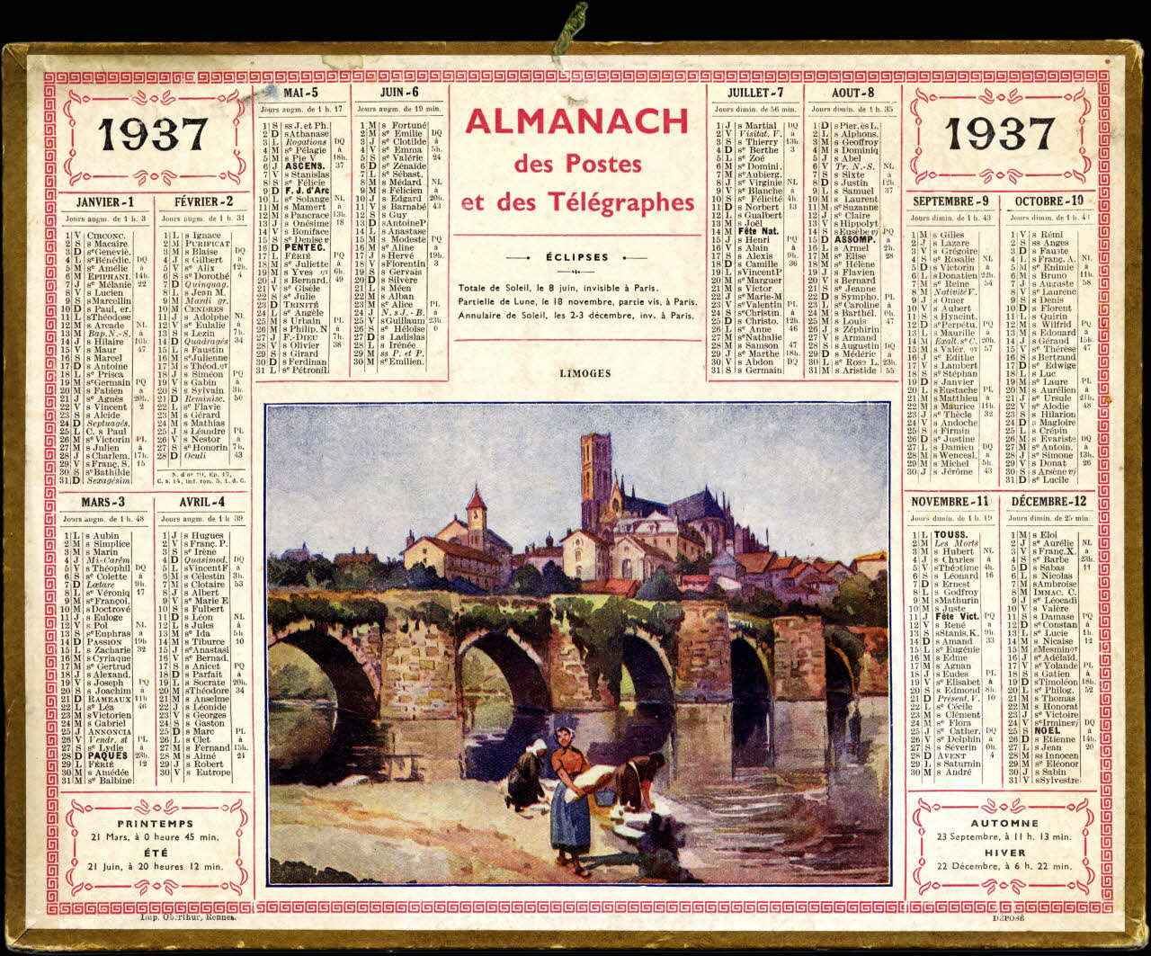 calendrier, ALMANACH des Postes et des Télégraphes 1937