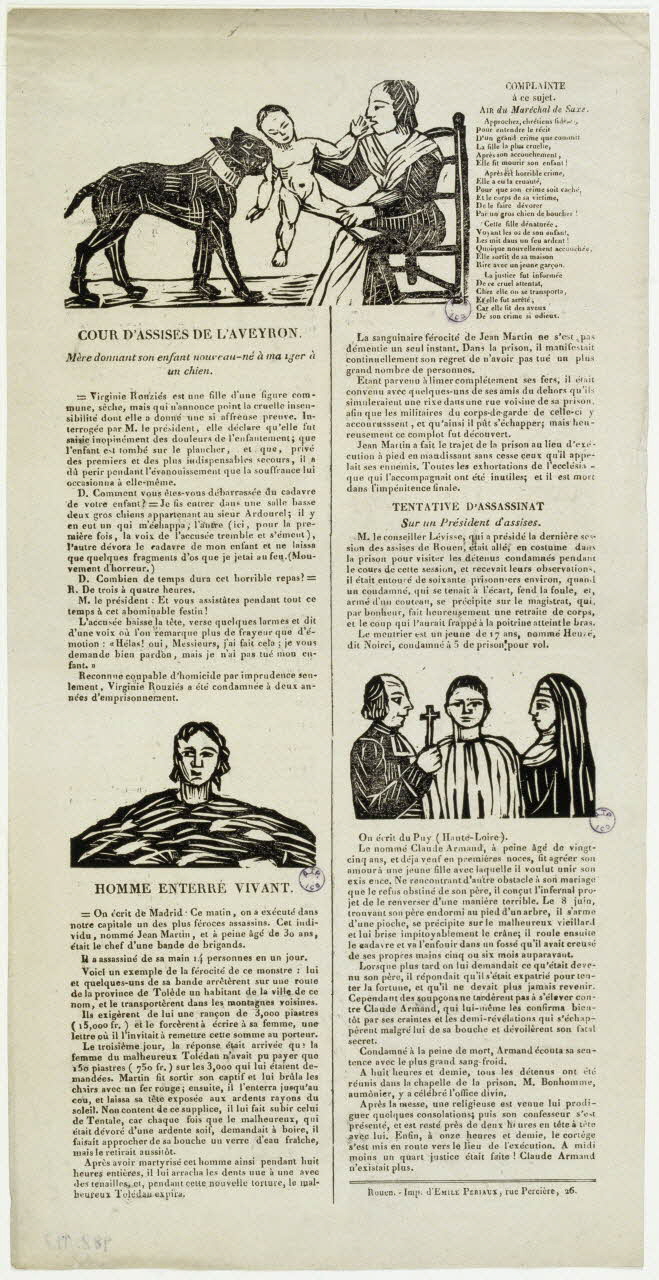 imagerie ancienne, canard, COUR D'ASSISES DE L'AVEYRON. HOMME ENTERRE VIVANT. TENTATIVE D'ASSASSINAT Sur un Président d'Assises.