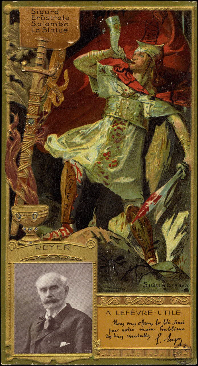 (ROGANEAU (h. g. de la scène centrale))(LITH. J. E. GOOSSENS, PARIS -LILLE (b. d.))(A LEFEVRE-UTILE Nous vous offrons le blé semé par votre main . Emblème des biens véritables E. Reyer (b. d., texte manuscrit imprimé))(SIGURD, EROSTRATE, SALAMBO, LA STATUE (h. g., titres imprimés des opéras de E. Reyer))Décor